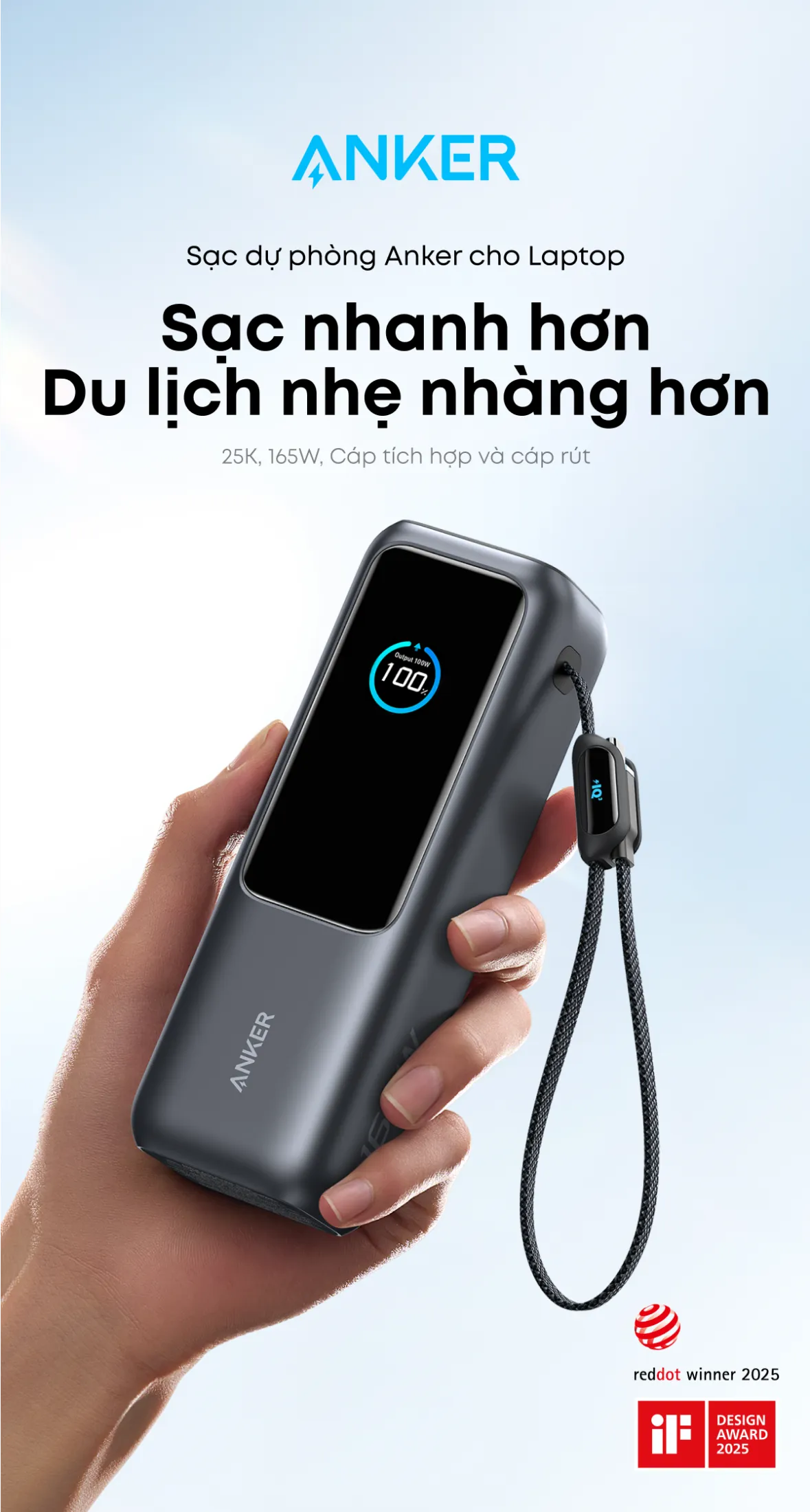 Bản thân Anker đã được biết đến với những giải thưởng thiết kế hàng đầu như iF DESIGN AWARD 2025 và REDDOT WINS 2025, chứng tỏ chất lượng vượt trội. Đặc biệt, Anker Power Bank 25k mang đến: