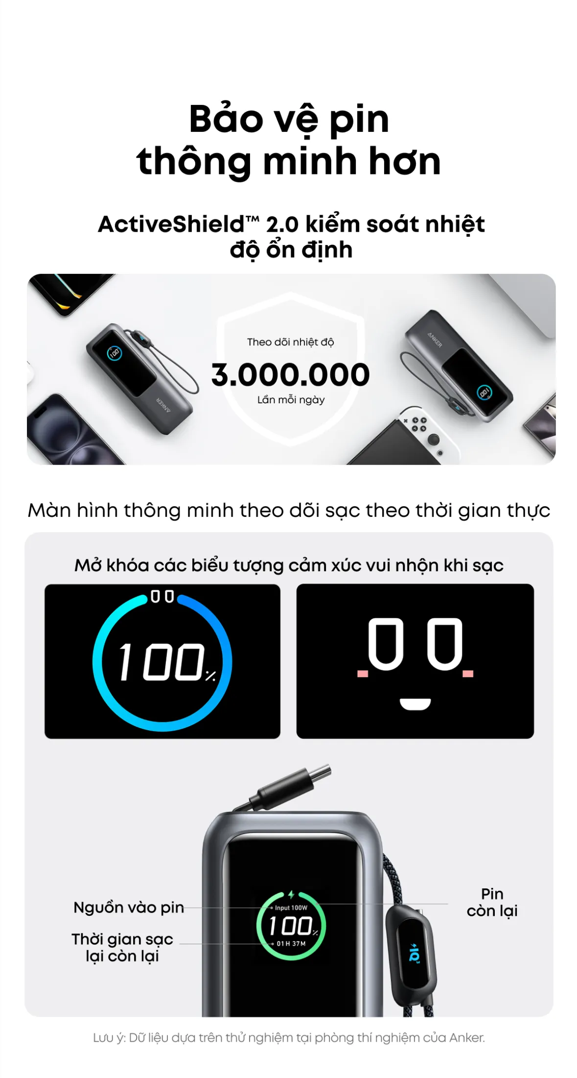 Anker luôn đặt bảo vệ pin lên hàng đầu. Công nghệ ActiveShield™ 2.0 giám sát nhiệt độ liên tục, điều chỉnh dòng điện tối ưu để tránh quá nhiệt và kéo dài tuổi thọ của bộ nhớ lít-ion.