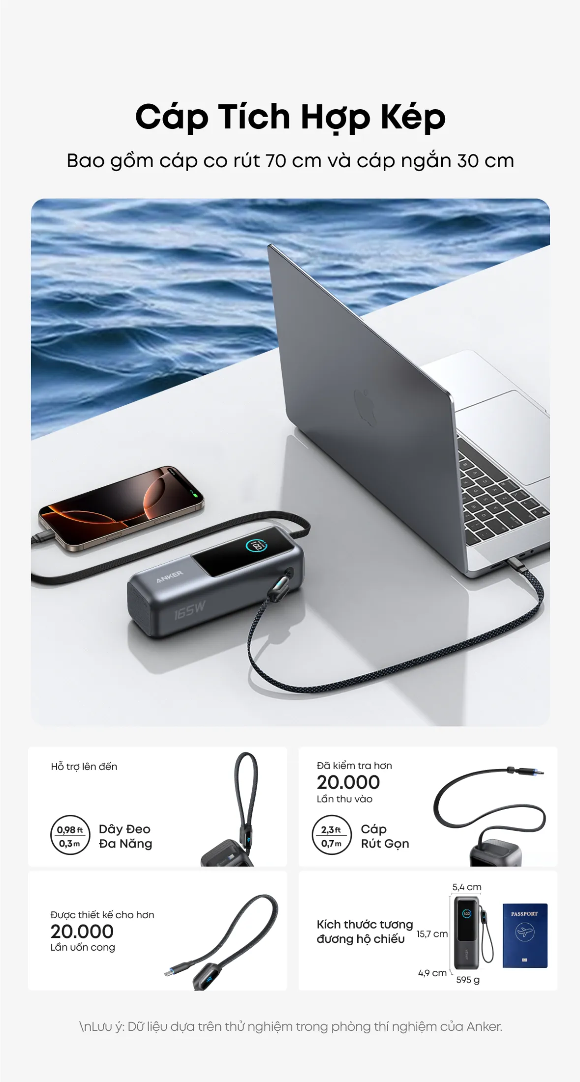 - Cáp tích hợp – một cáp rút 70 cm và một cáp ngắn 30 cm, có thể kéo dài tới 2.3 ft với độ bền hơn 20.000 lần uốn cong.