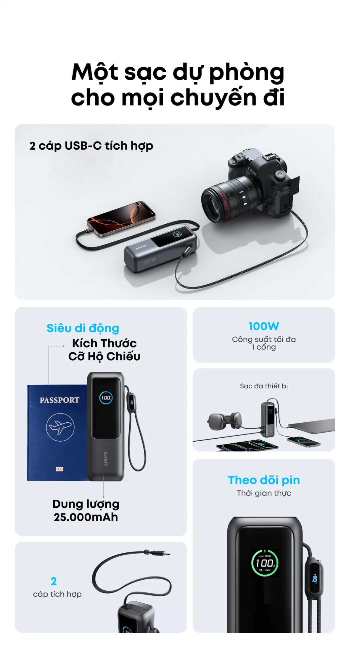 Anker Power Bank 25k thực sự là một giải pháp hoàn hảo cho những ai cần “sạc mọi thiết bị” trong cùng một hộp. Với dung lượng 25000mAh, tốc độ sạc lên tới 165W và ba cổng USB‑C, bạn có thể đồng thời nạp năng lượng cho MacBook, iPad Pro, điện thoại và bất kỳ thiết bị USB nào khác mà không cần chuyển đổi dây.