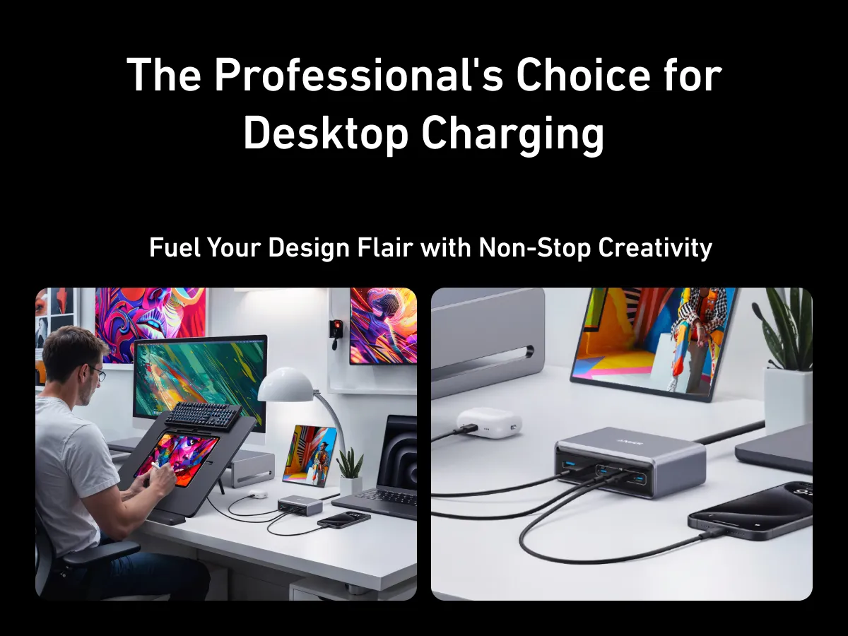 Với cấu hình Sạc đa cổng 6 thiết bị, Anker Prime giúp bạn tối ưu không gian làm việc. Hãy tưởng tượng một bàn làm việc gọn gàng với đầy đủ công cụ sáng tạo – MacBook Pro, iPhone, iPad, smartwatch, tai nghe và các phụ kiện khác được sạc đồng thời mà không cần phải kéo thêm nhiều dây cáp hay nguồn điện.