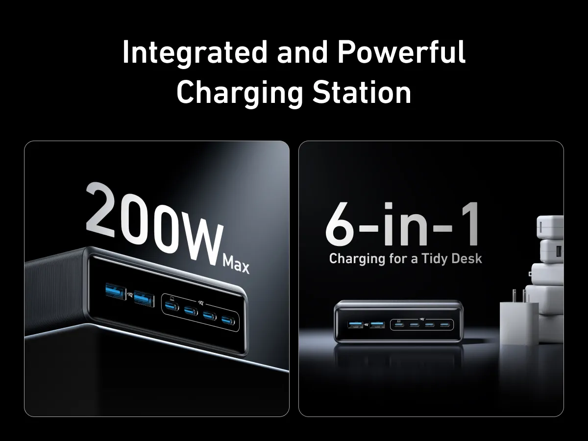 Thiết kế của Anker Prime 200W tập trung vào sự tiện lợi và hiệu quả. Với sáu cổng sạc đa năng, người dùng có thể đồng thời kết nối MacBook Pro, iPhone, iPad, Samsung Galaxy, hoặc bất kỳ thiết bị nào hỗ trợ USB‑C. Đặc biệt, mỗi Cổng USB C 100W tối đa được phân bổ linh hoạt: khi bạn sử dụng hai cổng cùng lúc, cả hai đều có thể cung cấp tới 100W, giúp giảm đáng kể thời gian sạc cho các laptop nặng như MacBook Pro 14″.