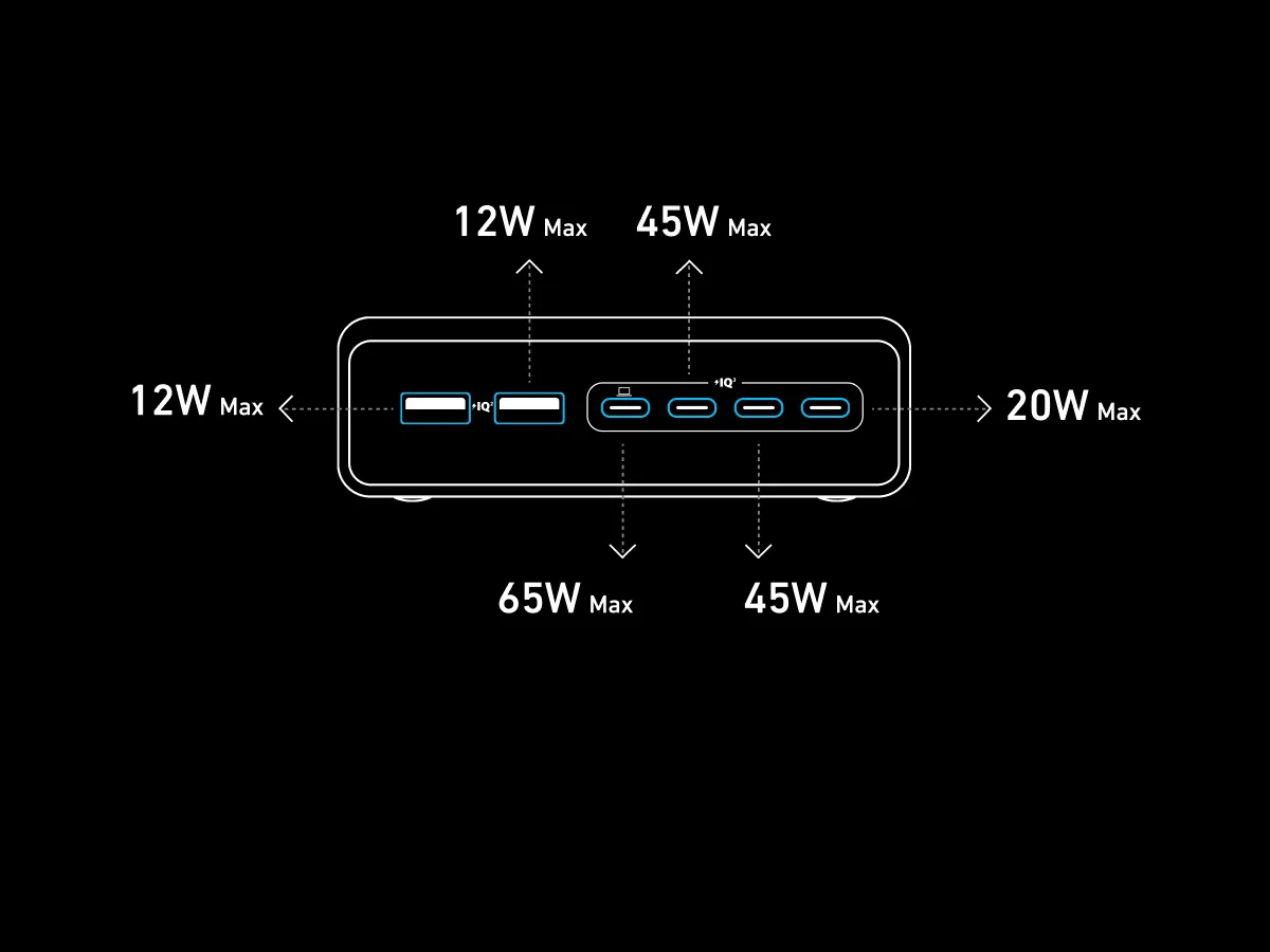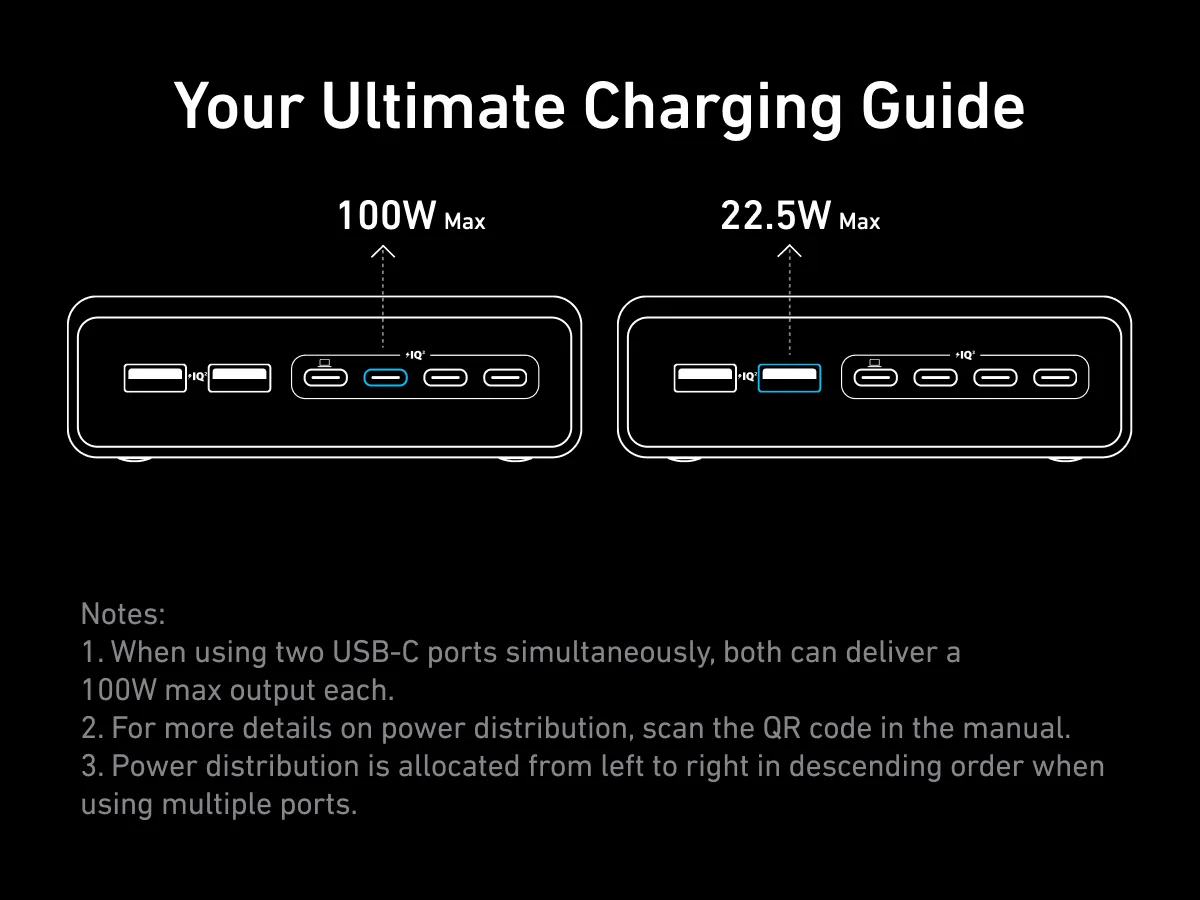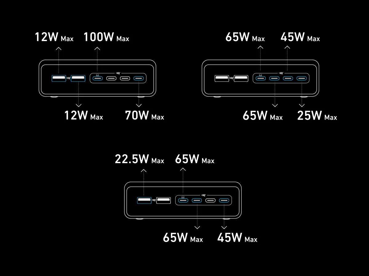 Khả năng phân phối công suất từ trái sang phải theo thứ tự giảm dần cũng cho phép người dùng dễ dàng biết đâu là cổng có thể cung cấp công suất lớn nhất trong tình huống đa thiết bị. Khi sử dụng hai cổng USB‑C cùng lúc, bạn sẽ nhận được Cổng USB C 100W tối đa từ cả hai, đồng thời các cổng còn lại vẫn duy trì công suất chuẩn phù hợp với thiết bị nhỏ hơn.