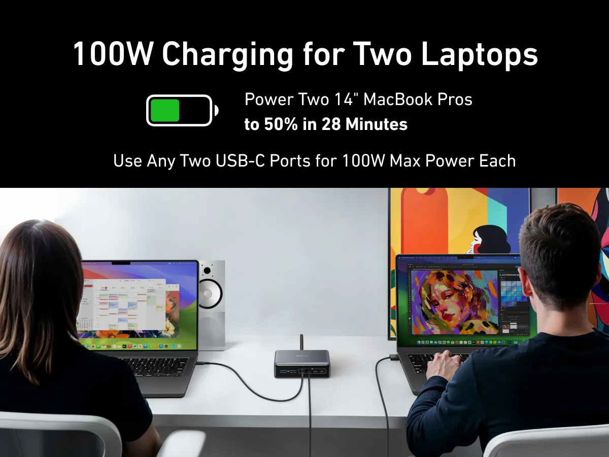 - 100W Max cho hai cổng USB‑C đồng thời: Đơn giản, nhanh chóng – một chiếc laptop lớn có thể được sạc tới 50% chỉ trong 28 phút.