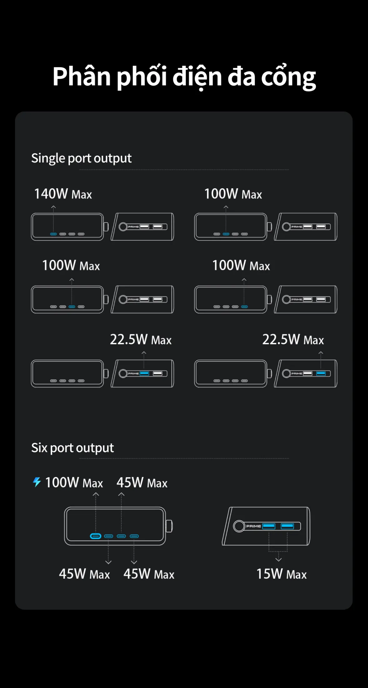Cho phép hai cổng đồng thời lên tới 240W, ba cổng tối đa 250W và bốn hoặc năm cổng vẫn duy trì 250W.