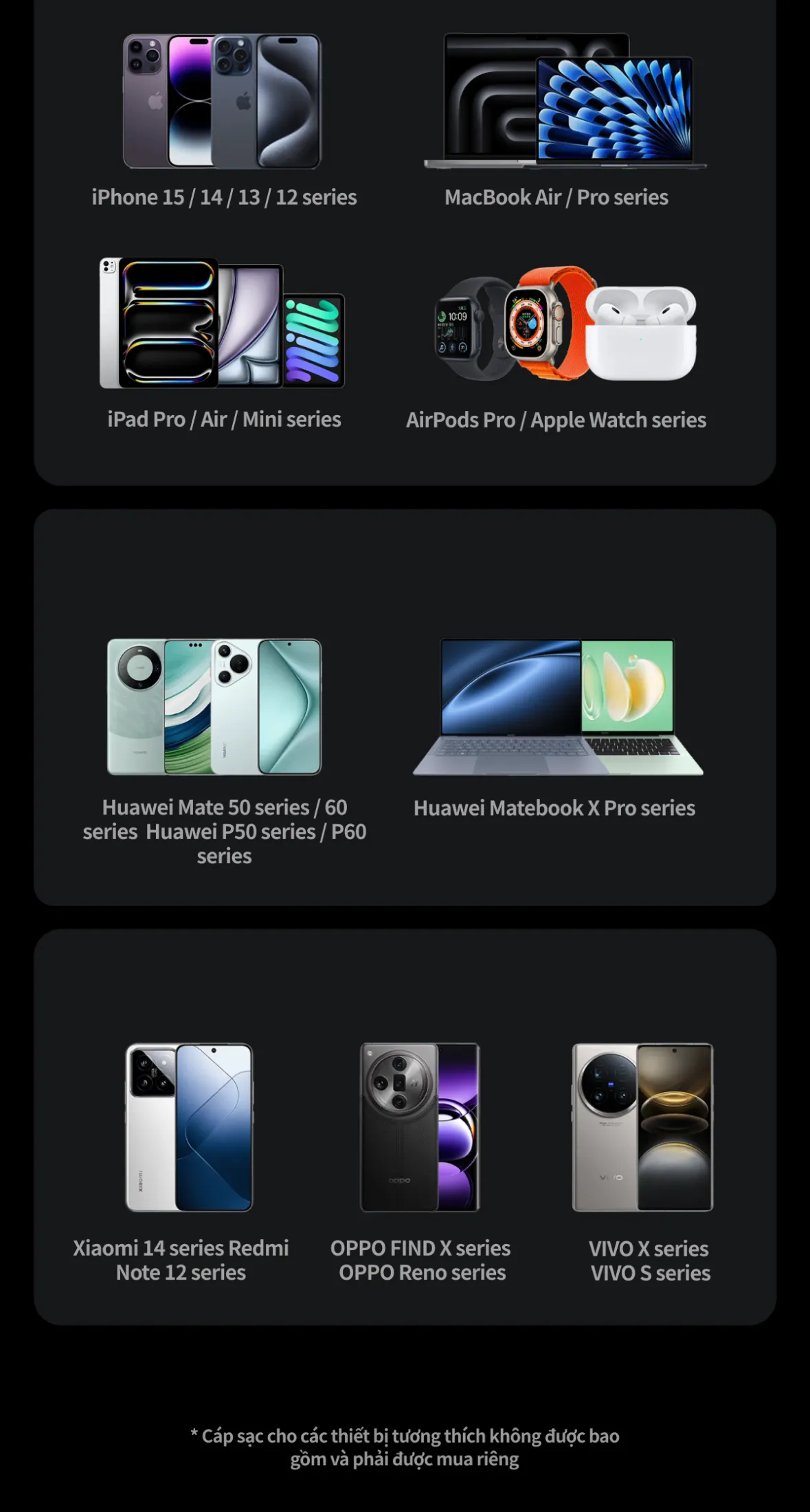 • Điện thoại và máy tính bảng đa dạng: iPhone 15/14/13 series, Samsung Galaxy, Huawei Matebook X Pro, Xiaomi 14 series…