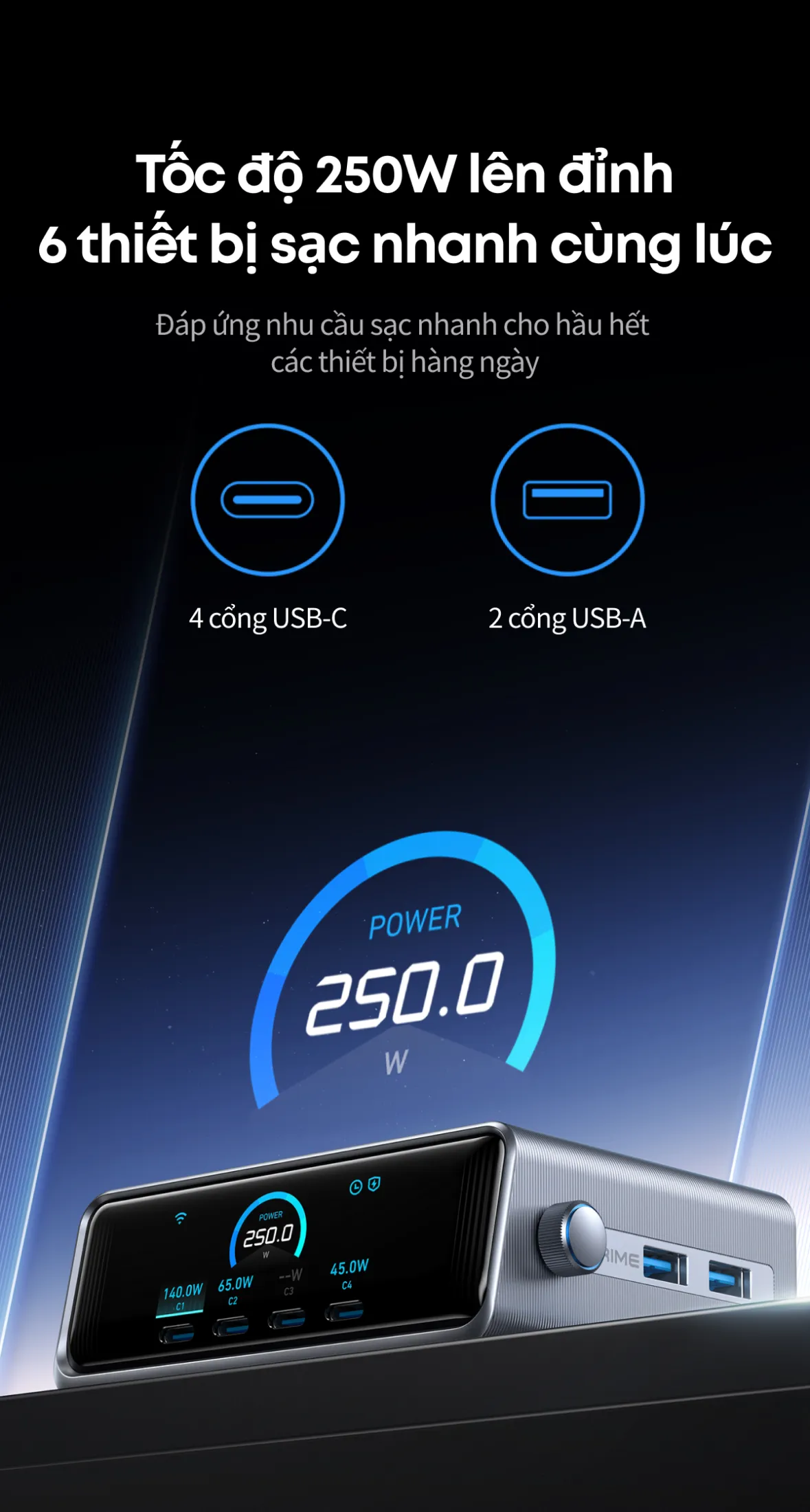 • Có công suất 250W, sạc nhanh 6 thiết bị cùng lúc.