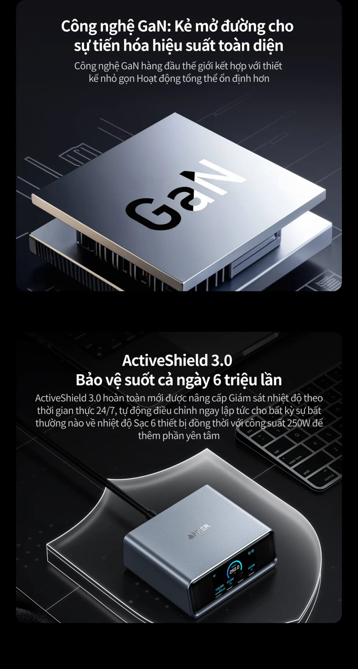 • Hiệu suất cao nhờ công nghệ GaN và bảo vệ an toàn ActiveShield 3.0.