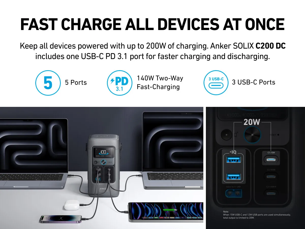 Anker SOLIX C200 DC Portable Power Station 60,000 mAh 200W Total Output 192Wh Portable Power Station, 5 Ports, LiFePO4 Battery, for Outdoor Camping, Traveling, and Emergencies (No Wall Charger Included) A1727