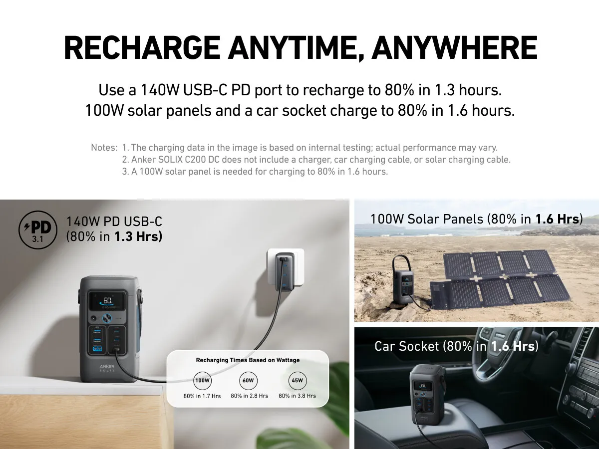 - 100W nguồn điện gắn xe hơi hoặc tấm pin mặt trời 100W: 80% trong 1.6 giờ.