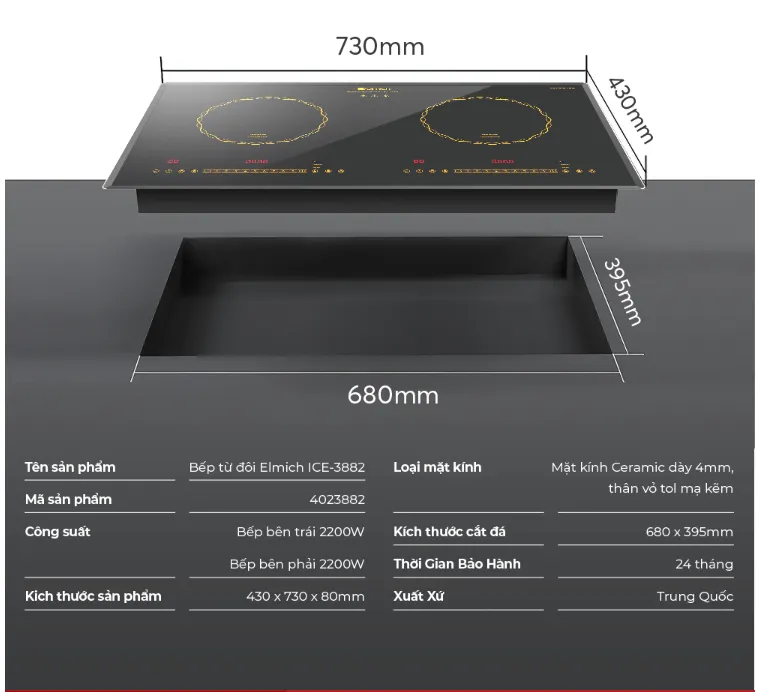 Elmich ICE-3495OL là dòng bếp từ đôi với công suất tối đa 2200W (có thể tăng lên 2500W khi bật Power Booster). Thiết kế viền nhôm ốp kính mang lại vẻ sang trọng, đồng thời giúp bề mặt không bị vỡ kính nếu lắp đặt đúng cách. Kích thước tổng thể là 730x430mm với độ dày 80mm, phù hợp cho hầu hết các phòng bếp hiện đại.
