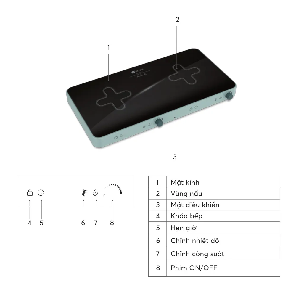 • Đèn báo hoạt động – luôn hiển thị trạng thái của bếp, giúp người dùng dễ dàng quan sát và kiểm soát.