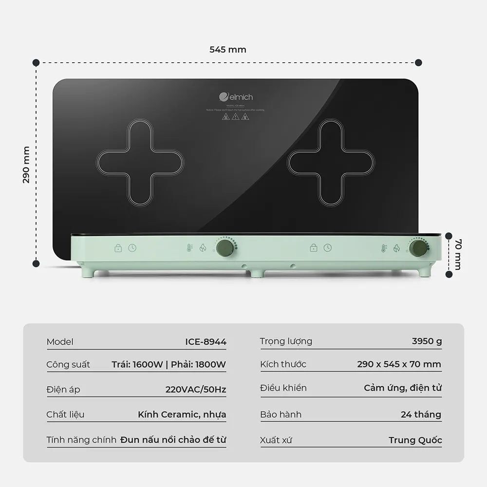 Bếp từ Elmich ICE‑8944 là dòng bếp từ đôi với công suất 1600W (vùng trái) và 1800W (vùng phải), tổng cộng lên tới 3400W. Thiết kế bề mặt kính ceramic cao cấp giúp truyền nhiệt nhanh chóng, đồng thời chịu va đập mạnh và chống sốc nhiệt đến 700 °C – một tiêu chuẩn an toàn đáng tin cậy cho mọi gia đình.