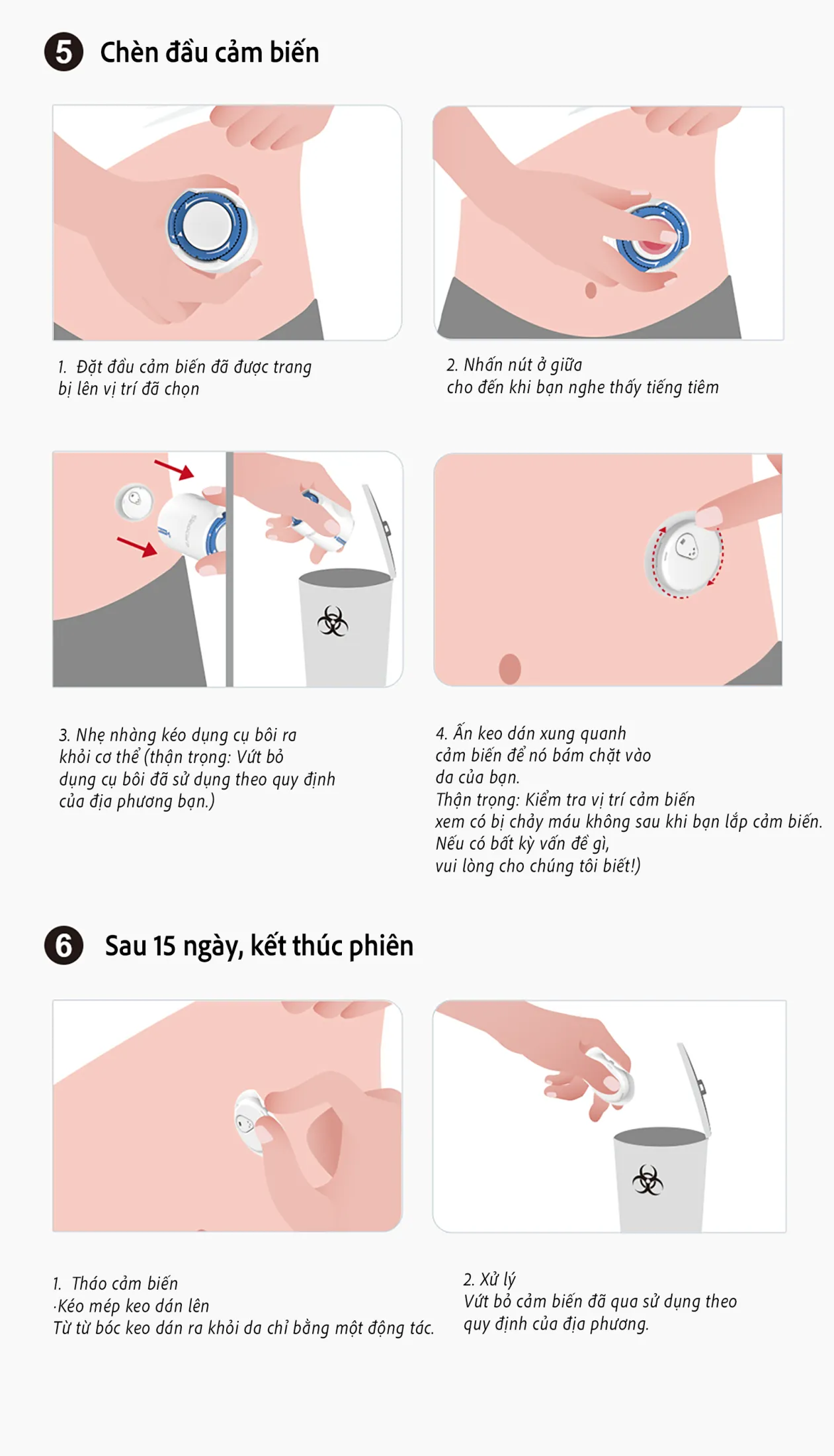 - Lắp đặt cảm biến: Vị trí khuyến nghị là vùng bụng, tránh gần rốn. Sử dụng tấm dán dính chuyên dụng và lắc nhẹ để gắn chắc.