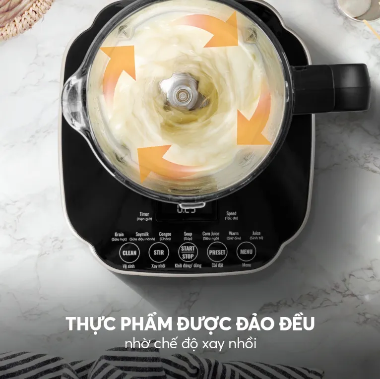 - Khả năng làm nóng đều 360°: Động cơ mạnh mẽ giúp nhiệt độ phân bố đồng đều khắp cối, tránh tình trạng “đào” hoặc “lệch” khi nấu.