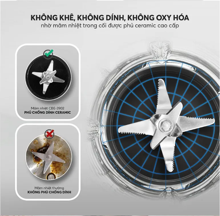 - Cối xay thủy tinh cao cấp : Chất liệu thủy tinh chất lượng giúp tránh khô, dính và oxy hóa thực phẩm. Đặc biệt, mâm nhiệt trong cối được phủ ceramic cao cấp, ngăn chặn hiện tượng gỉ sét hay dính nóng.