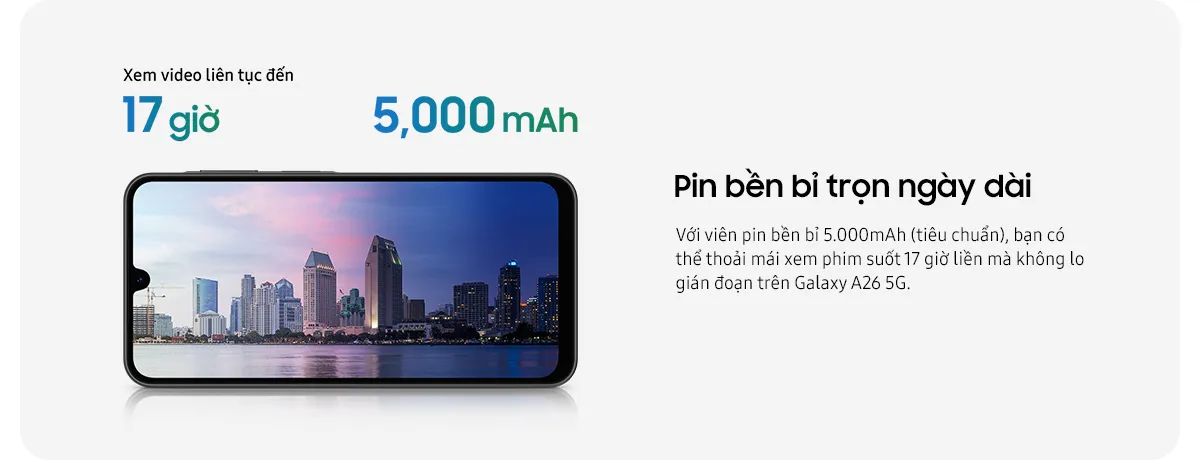 Một điểm mạnh khác của Galaxy A26 5G là pin dung lượng 5000 mAh. Đặc biệt, công nghệ sạc nhanh 25W giúp bạn chỉ cần vài phút để có được một mức độ sạc đáng kể. Khi sử dụng trong thực tế, chiếc phone này thường xuyên duy trì hoạt động 1–2 ngày với mức tiêu thụ trung bình cho các tác vụ thông thường.