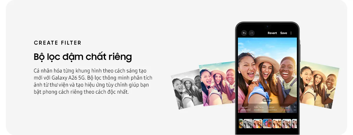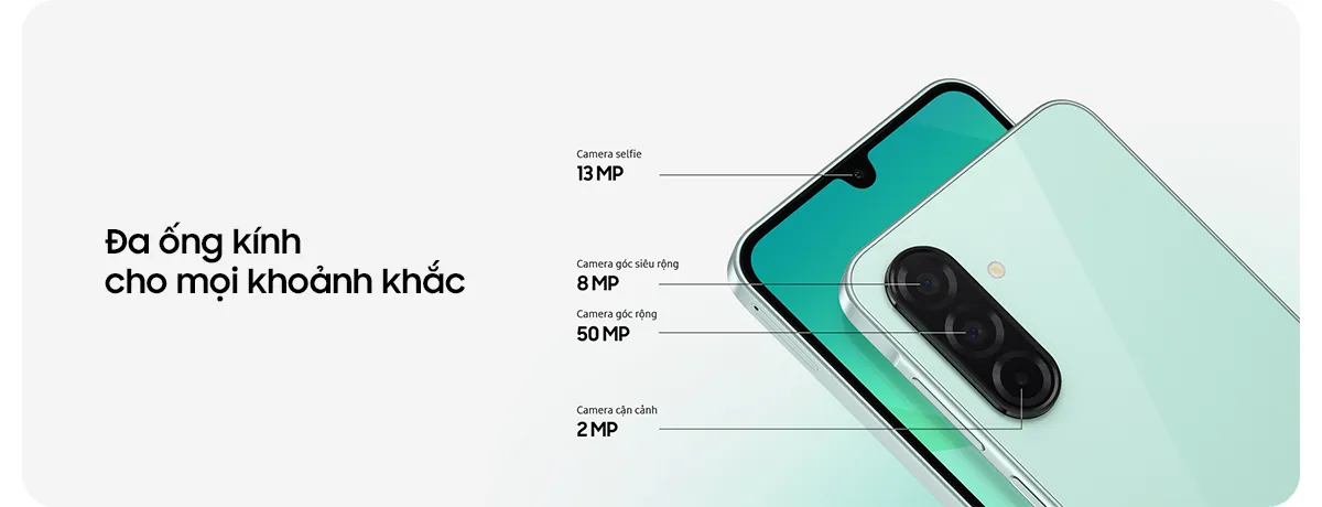 Một trong những điểm nhấn của Galaxy A26 5G chính là bộ camera hậu 50+8+2 MP. Đặc biệt, tính năng Camera chụp đêm được tối ưu giúp bạn ghi lại những khoảnh khắc dưới ánh sáng yếu mà không mất chất lượng. Ngoài ra, máy còn hỗ trợ quay phim UHD 4K (3840 × 2160) @30fps và chế độ quay chuyển động trôi nhanh/điều khiển chậm.