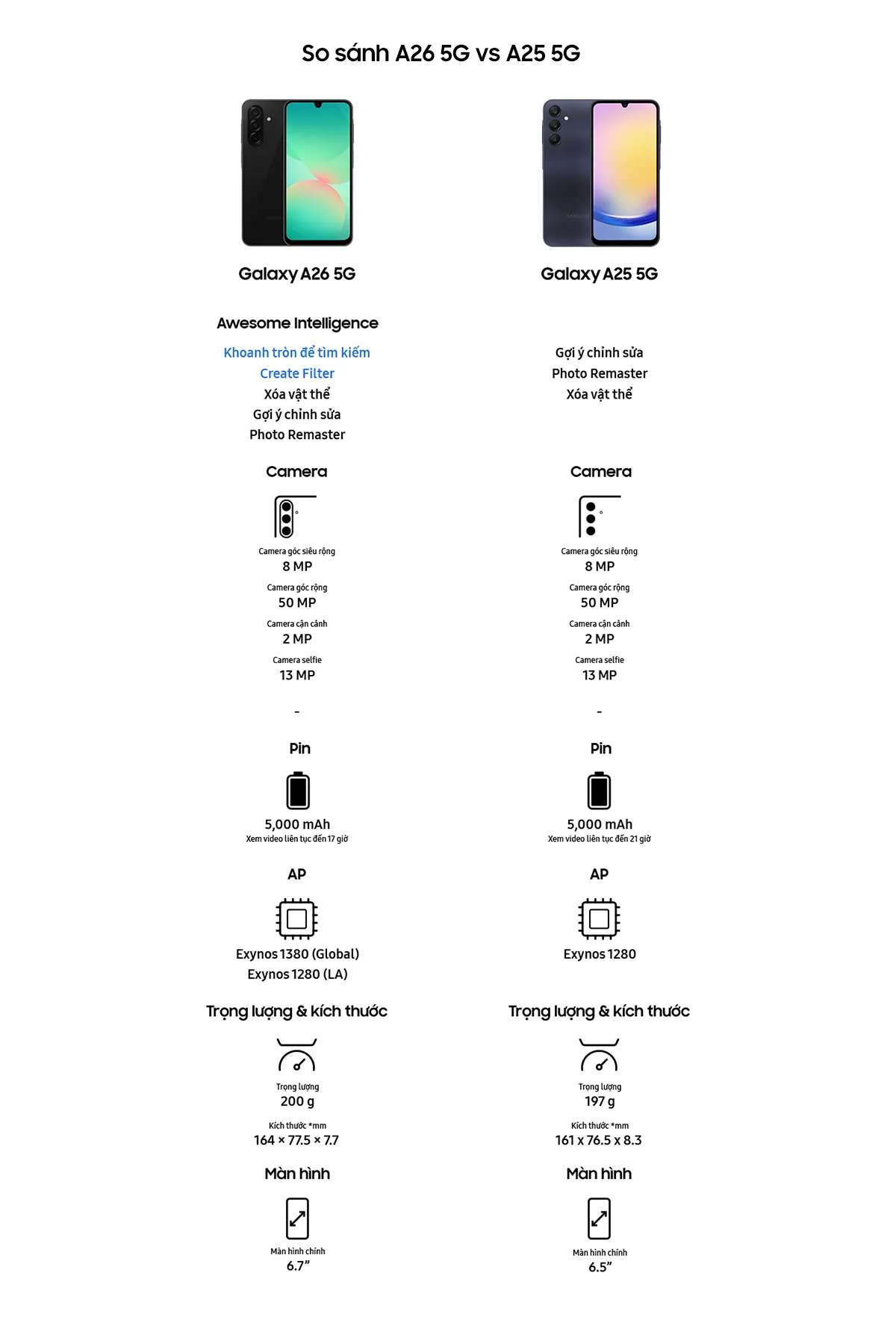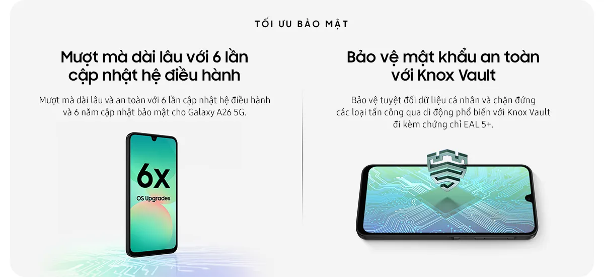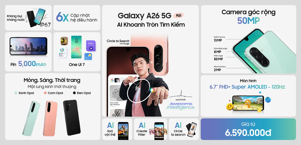 Đối với những tín đồ công nghệ Việt Nam, chiếc điện thoại Galaxy A26 5G vừa ra mắt trong dòng Galaxy A đã nhanh chóng trở thành “ngôi sao” giữa các mẫu trung cấp. Không chỉ được trang bị màn hình Super AMOLED 6,7 inch với độ phân giải FHD+ và tần số quét 120 Hz, chiếc phone còn sở hữu nhiều tính năng độc đáo như Mặt lưng kính Gorilla, Camera chụp đêm chuyên nghiệp và pin dung lượng 5000 mAh. Để hiểu rõ hơn về sản phẩm này, chúng ta cùng khám phá chi tiết từng khía cạnh – từ thiết kế, màn hình, camera, CPU, bộ nhớ cho tới tính năng 5G mà Samsung mang lại.