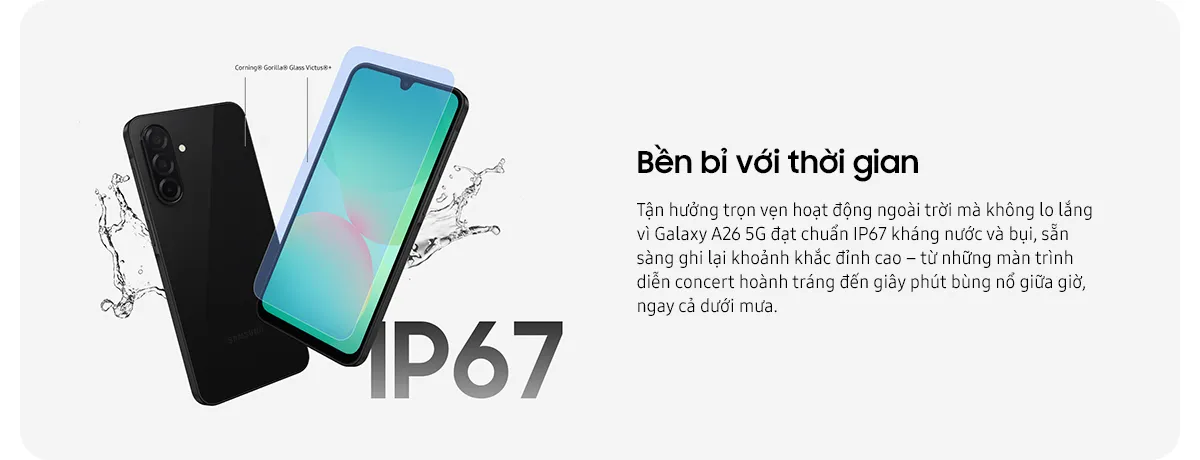 Galaxy A26 5G được làm bằng khung nhựa mềm mại nhưng vẫn giữ được độ bền cao nhờ lớp vỏ ngoài Mặt lưng kính Gorilla. Khi nắm máy, cảm giác chắc chắn và thời trang ngay lập tức. Kích thước: 164 mm chiều dài, 77,5 mm rộng và 7,7 mm dày – trọng lượng chỉ 200 g, giúp dễ dàng mang theo bất kỳ nơi nào.