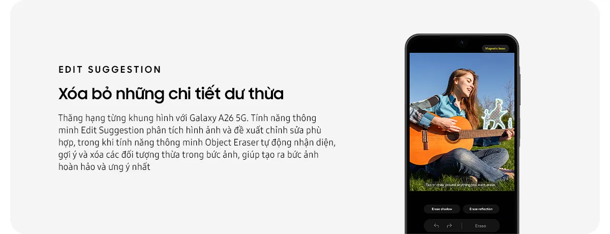 Galaxy A26 5G không chỉ là một chiếc điện thoại; đó là sự kết hợp hoàn hảo giữa thiết kế tinh tế, hiệu năng mạnh mẽ và tính năng camera tiên tiến. Với khung vỏ nhựa và mặt lưng kính Gorilla, máy vừa bền chắc lại vẫn nhẹ nhàng. Độ phân giải 50 MP và Camera chụp đêm mang đến những ảnh sắc nét ngay cả trong điều kiện ánh sáng yếu.
