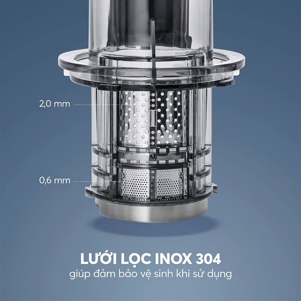 - Lưới lọc inox 304: Chất liệu cao cấp giúp giữ sạch bã và ngăn chặn rắc rối khi vệ sinh. Lưới này còn giúp máy ép dễ dàng làm sạch sau mỗi lần sử dụng.