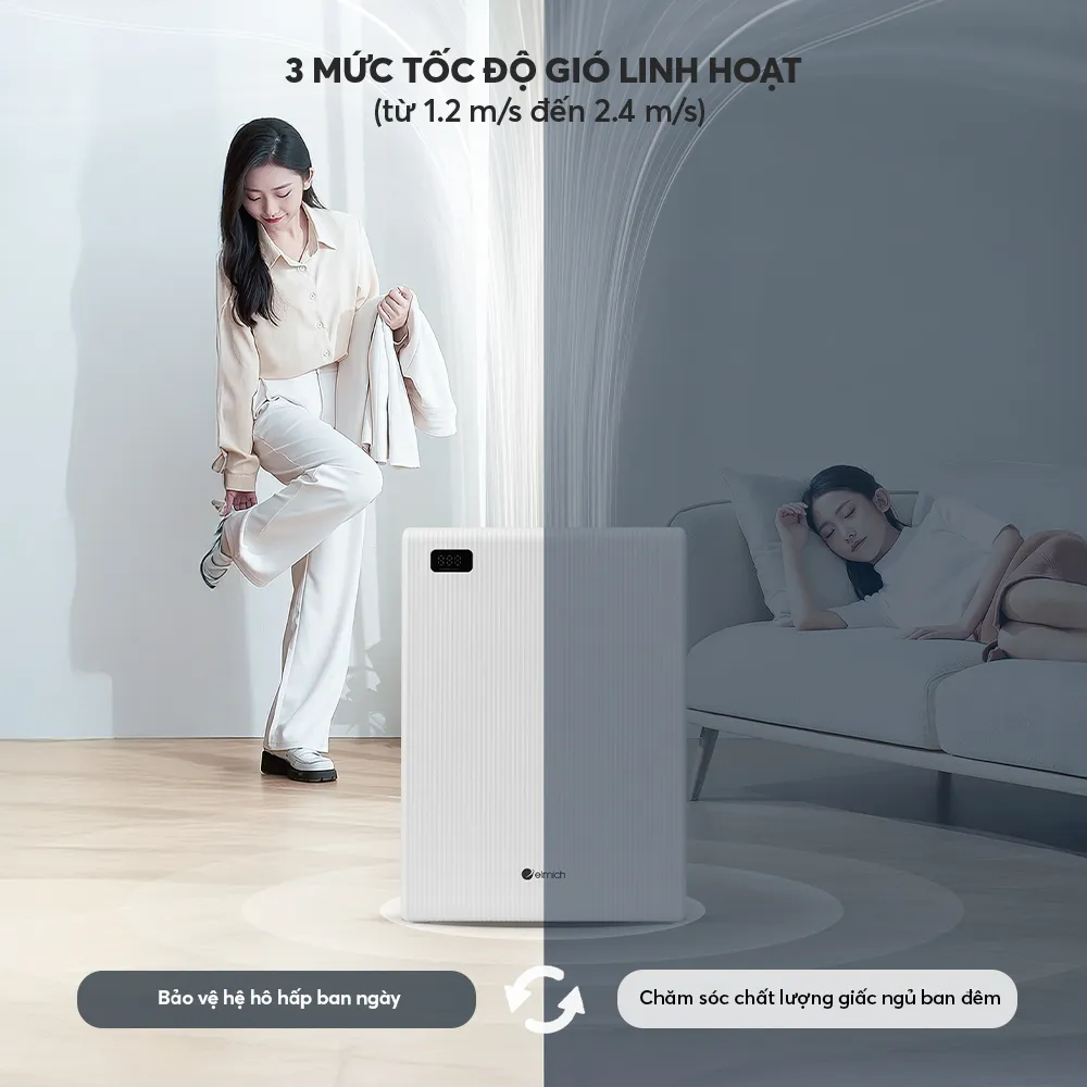 - Tốc độ gió linh hoạt (0.8‑3.6 m/s) giúp duy trì lưu thông không khí liên tục mà vẫn êm ái.