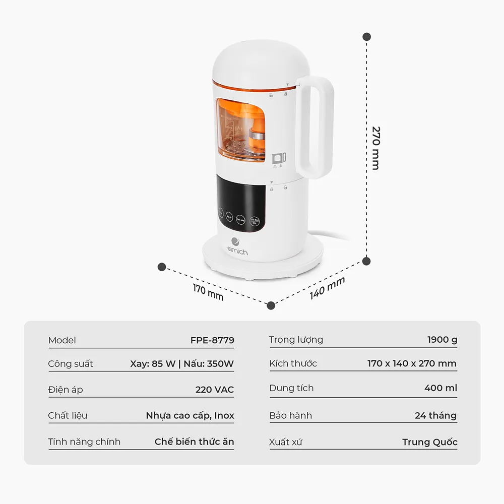 Elmich FPE-8779 được thiết kế với phong cách hiện đại, nhỏ gọn nhưng đầy đủ chức năng. Với dung tích 400 ml và công suất nấu 350 W cùng động cơ xay 85 W, sản phẩm có thể chế biến thức ăn dặm một cách nhanh chóng, đồng thời đảm bảo an toàn cho bé.