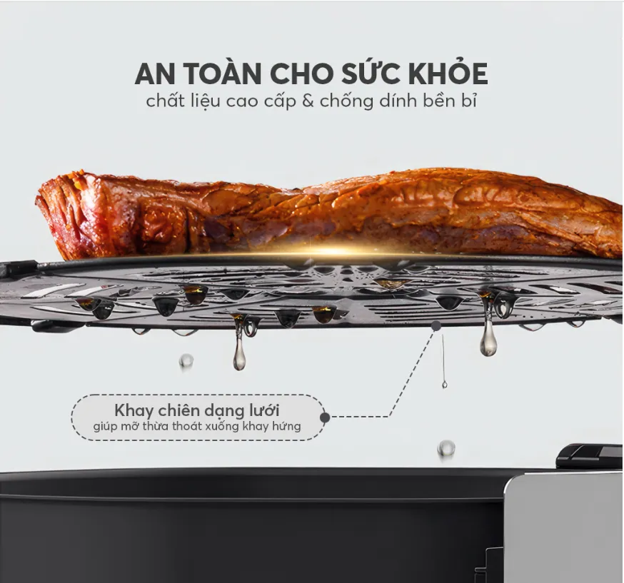 - Chất liệu chống dính cao cấp: Bề mặt lưới và nồi chiên được phủ lớp chống dính an toàn thực phẩm, giúp việc vệ sinh trở nên dễ dàng hơn bao giờ hết.