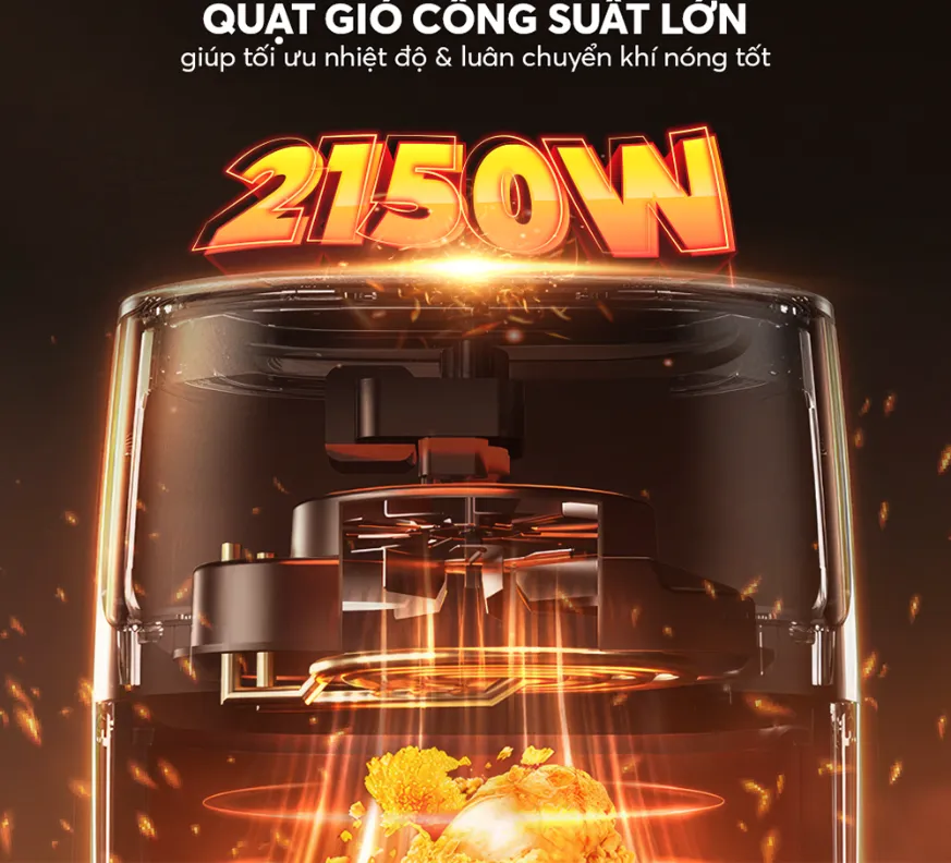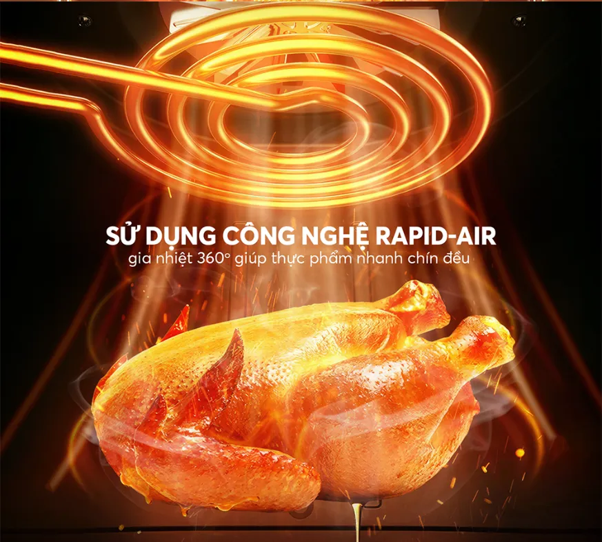 - Công nghệ Rapid-Air: Sử dụng khí nóng xoay quanh thực phẩm với tốc độ cao, giúp các món ăn chín đều và giòn rụm mà không cần dầu mỡ. Đặc biệt, quạt gió công suất lớn tối ưu nhiệt độ, giảm thời gian nấu 50% so với truyền thống.