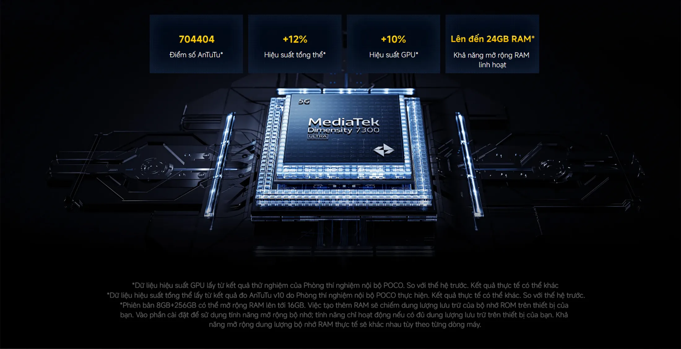 Bộ vi xử lý D7300 Ultra của POCO X7 được chế tạo trên công nghệ 4nm, mang lại hiệu suất cao và tiêu thụ điện năng tối ưu. Với cấu hình 8 nhân (4+4), CPU có thể cân bằng giữa sức mạnh và tiết kiệm pin khi chạy các tác vụ nặng như game hay chỉnh sửa video.
