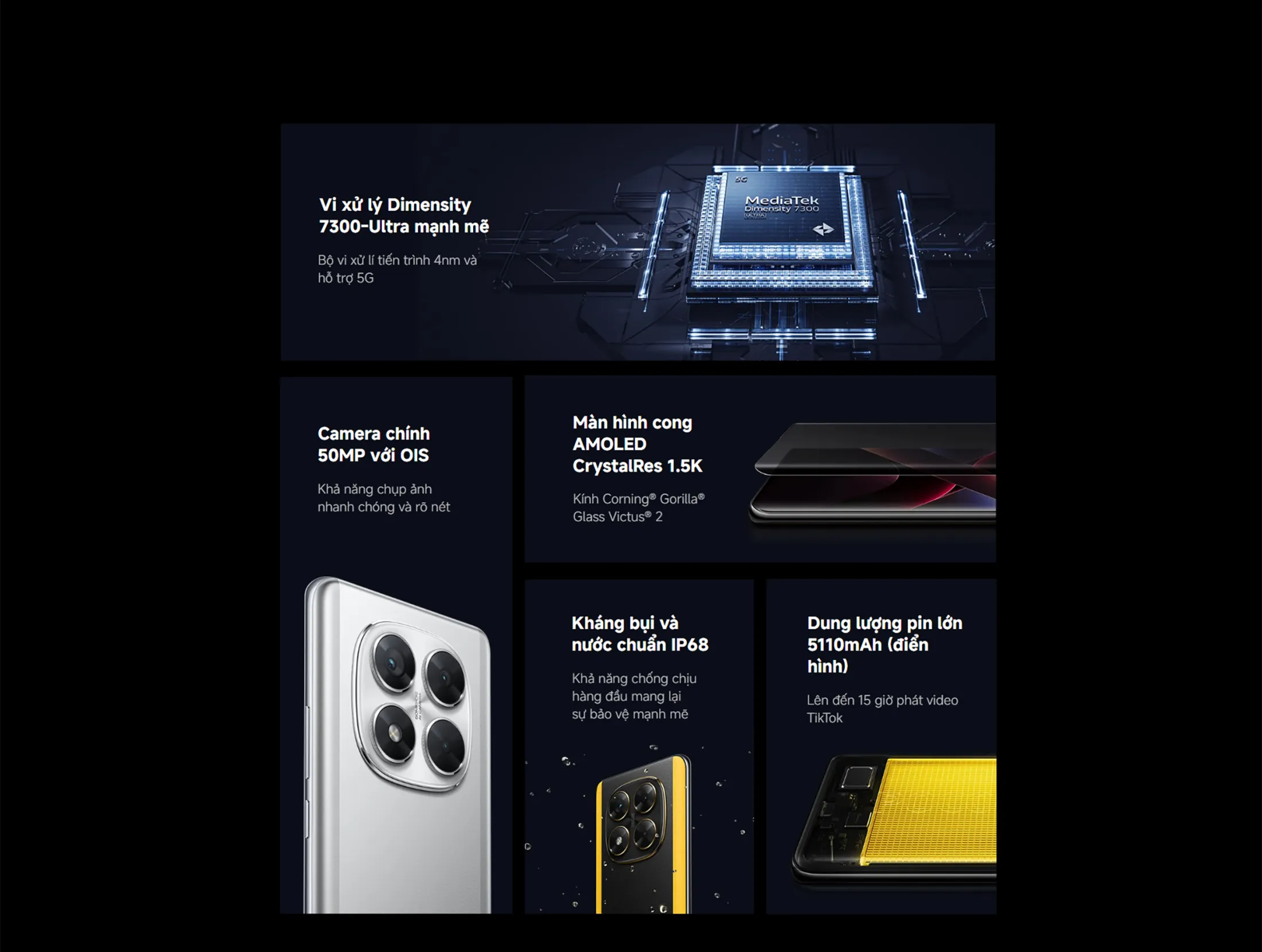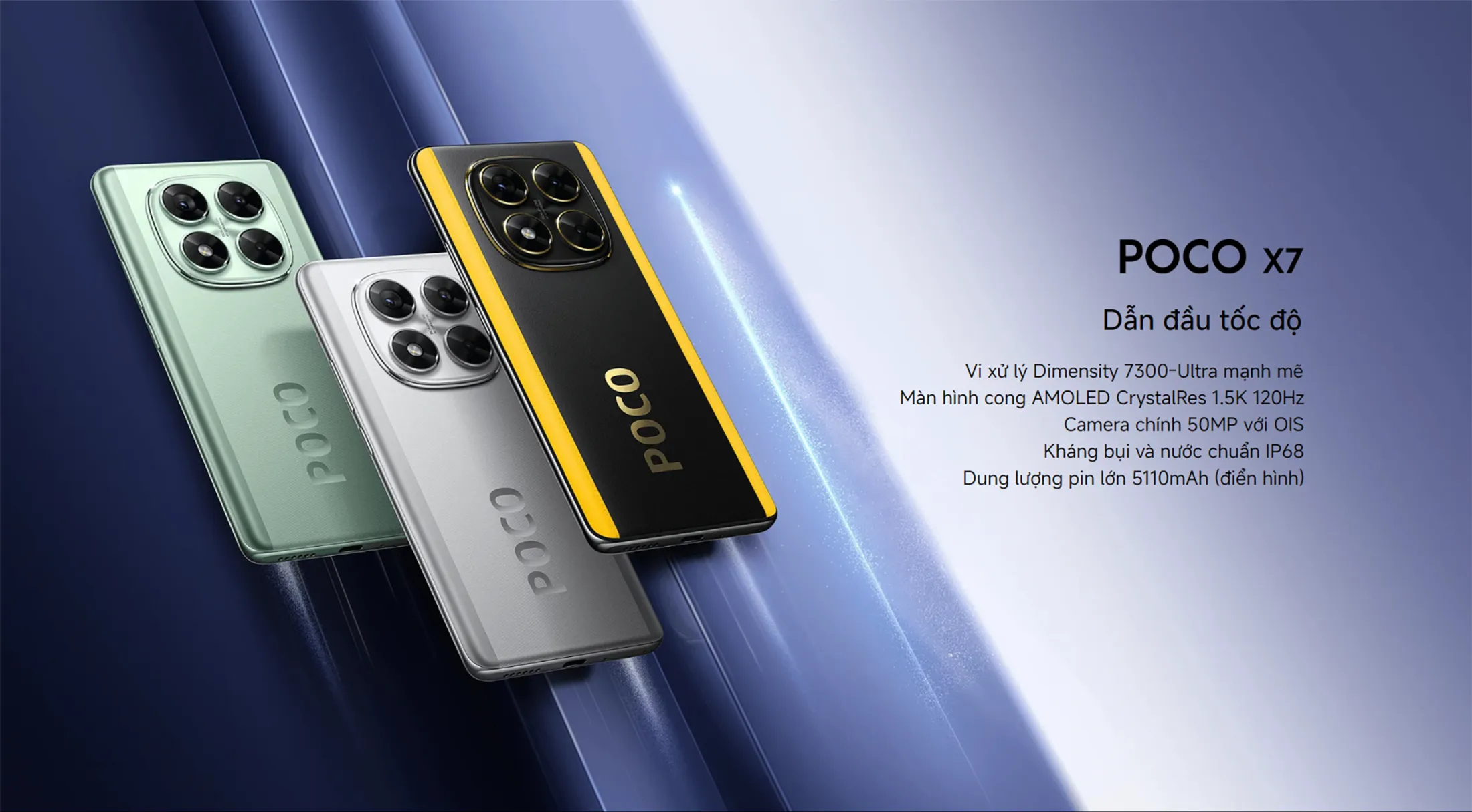 Được ra mắt với thương hiệu POCO – một nhánh của Xiaomi tập trung vào công nghệ tiên tiến và giá thành hợp lý, POCO X7 5G đã nhanh chóng thu hút sự chú ý của người tiêu dùng. Mẫu điện thoại này kết hợp nhiều tính năng đỉnh cao: D7300 Ultra – bộ vi xử lý 4nm từ TSMC; màn hình cong 3D với độ phân giải 1.5K và tốc độ quét 120Hz; camera chính 50MP với OIS; pin dung lượng lớn 5110mAh; và bảo vệ IP68 cho tính bền bỉ.