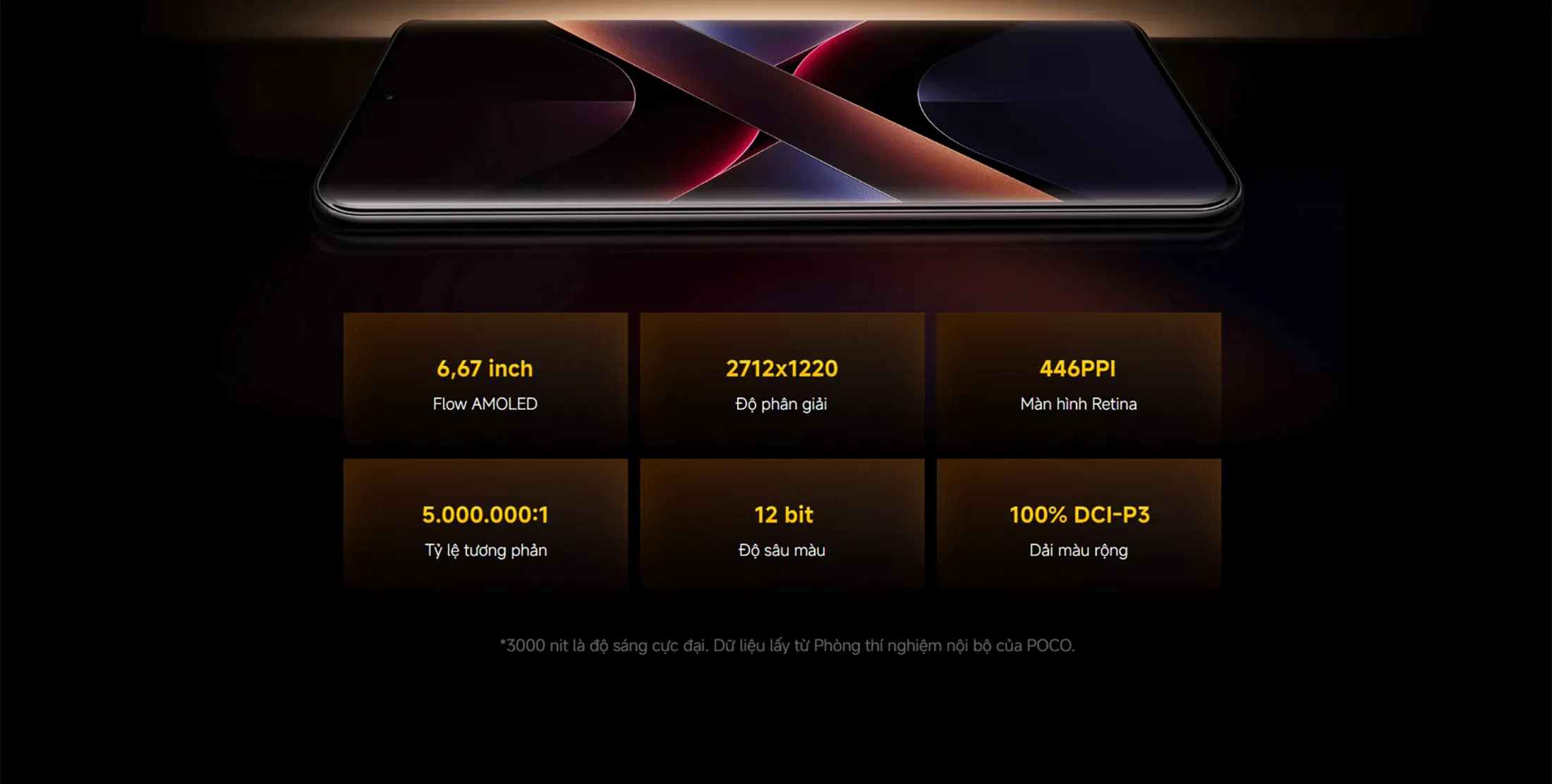 Màn hình 6.67 inch Flow AMOLED của POCO X7 cung cấp độ phân giải 2712×1220, tỉ lệ PPI lên tới 446 và độ sáng tối đa 3000 nit. Công nghệ AMOLED 120Hz cho tốc độ làm mới nhanh hơn, giảm rung lưới khi cuộn nội dung hay chơi game.