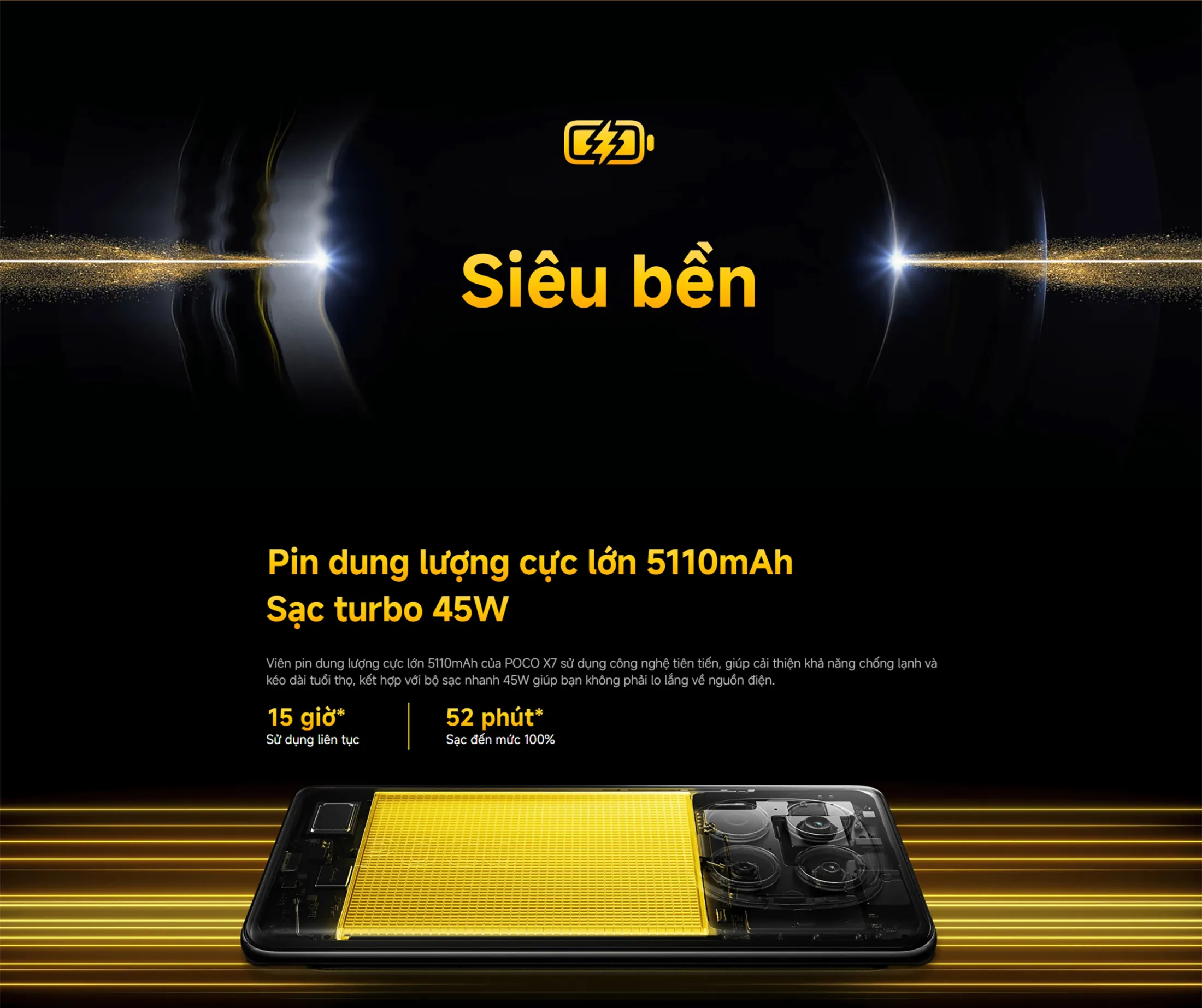 POCO X7 5G trang bị pin 5110mAh, kết hợp với bộ sạc nhanh 45W. Theo các thử nghiệm nội bộ, người dùng có thể xem video TikTok tới 15+ giờ hoặc nghe nhạc hơn 58 giờ mà không cần nạp điện thường xuyên.