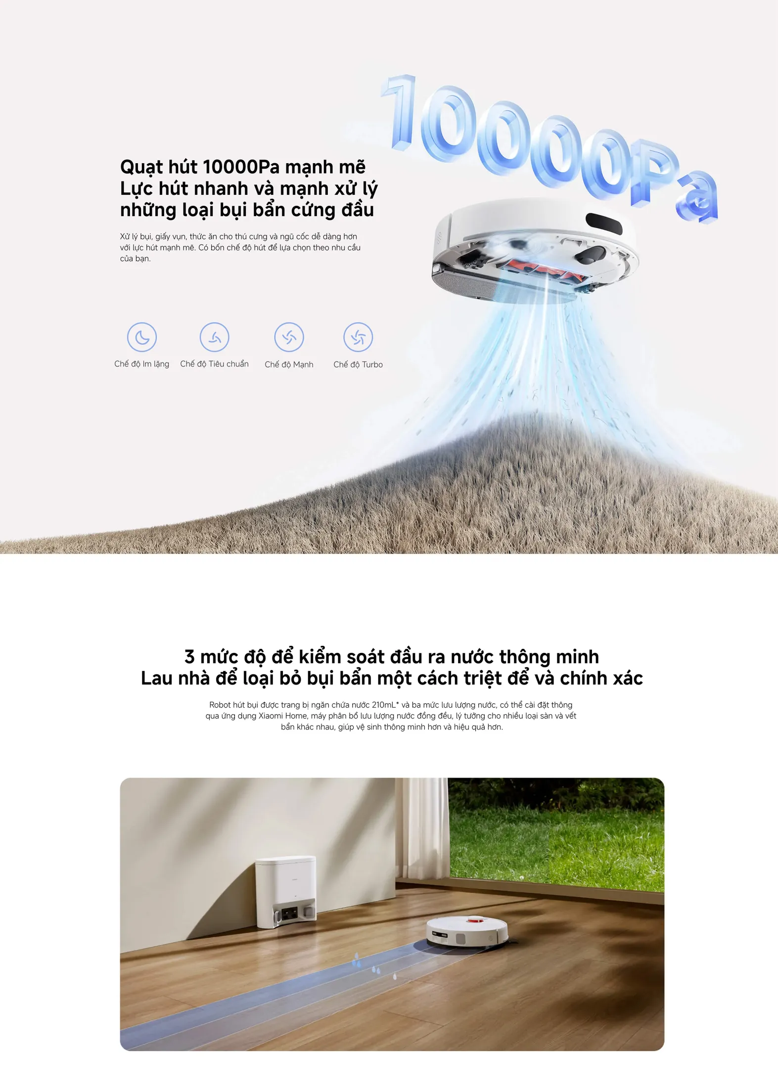 - Lau nhà hiệu quả: Ngăn chứa nước 210ml và ba mức lưu lượng nước giúp lau sạch sàn gạch, thảm và các vết bẩn khác một cách tự động.