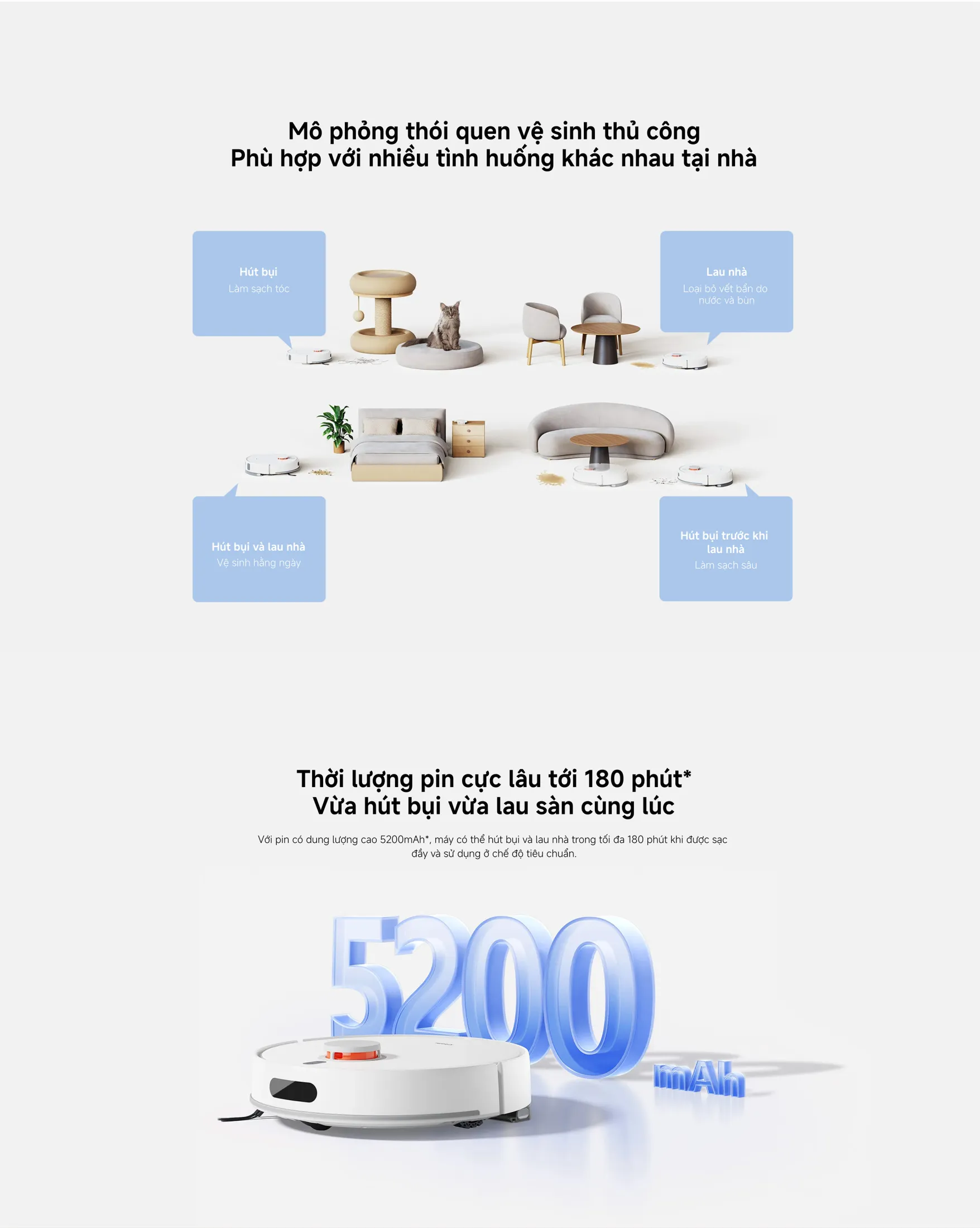 Xiaomi đã mang đến một chiếc robot hút và lau nhà đa năng, tích hợp pin 5200mAh cho thời lượng chạy lâu dài. Bên cạnh đó, hệ thống chổi thiết kế độc đáo giúp loại bỏ lông thú cưng và tóc người dùng mà không bị rối.