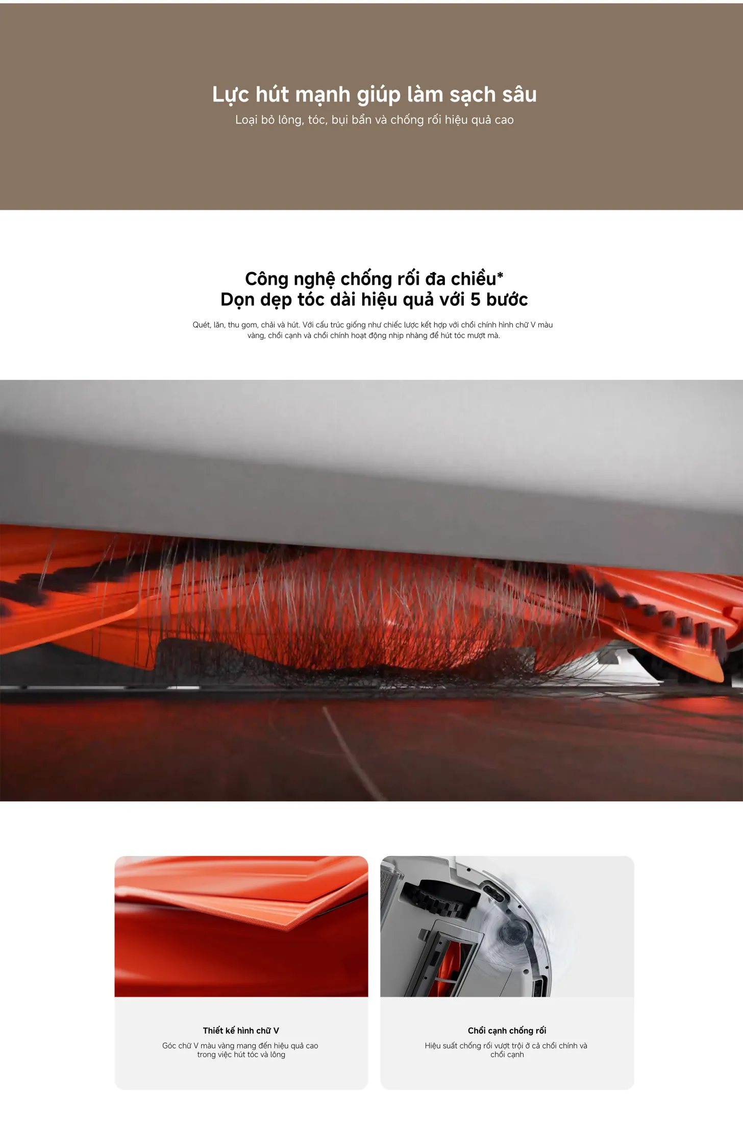 Nhờ cấu trúc chổi V màu vàng và chổi cạnh chống rối, robot có thể “đánh gỡ” tóc lông một cách nhanh chóng. Thực tế, quá trình hút tóc ngay không chỉ giúp giảm thiểu việc tắc nghẽn mà còn bảo vệ đầu lỗ hút, kéo dài tuổi thọ của thiết bị.