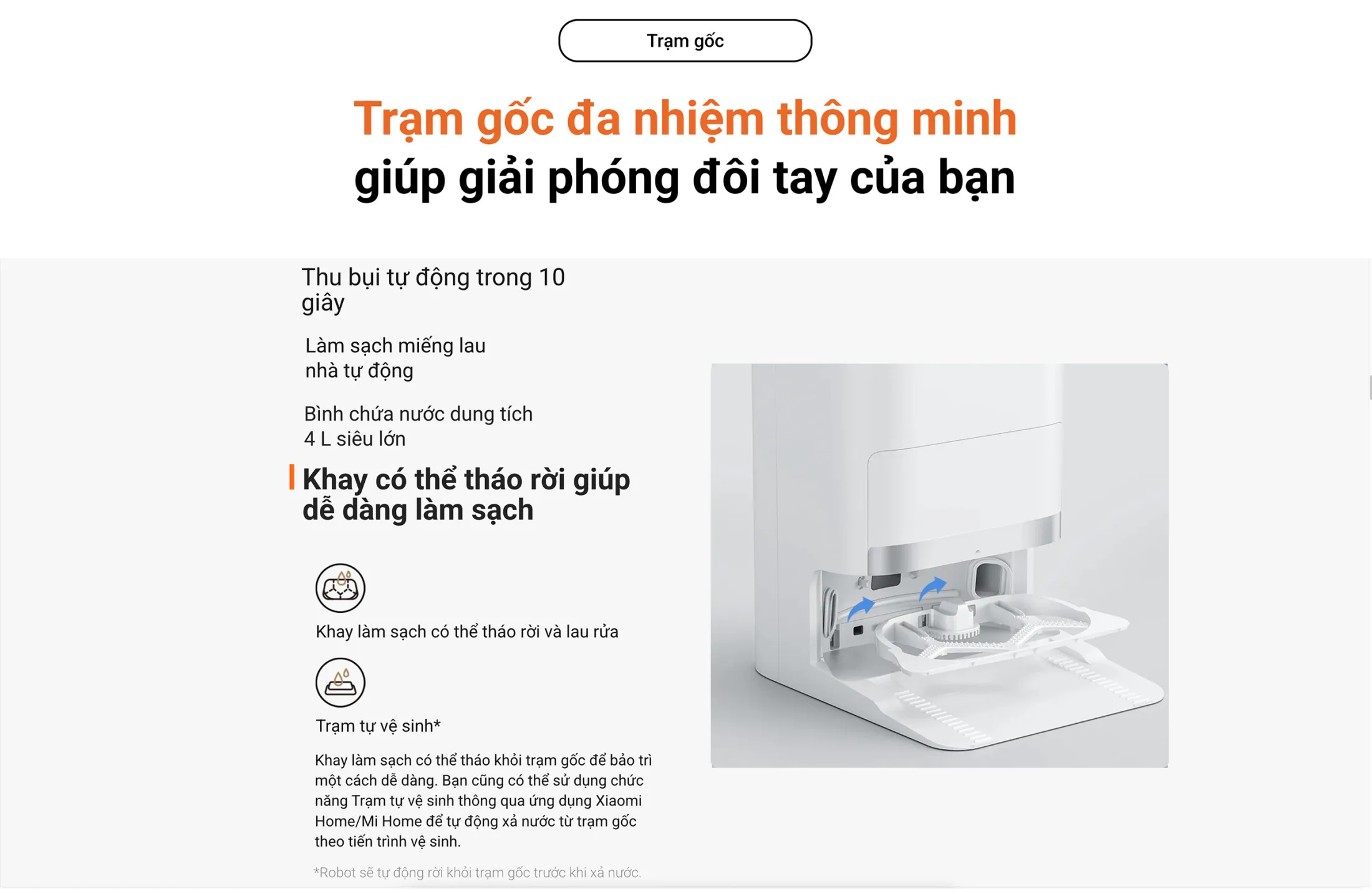 - Trạm gốc đa nhiệm thông minh: Khả năng thu bụi tự động trong 10 giây, làm sạch miếng lau nhà một cách hoàn hảo và chứa nước dung tích lớn 4L.