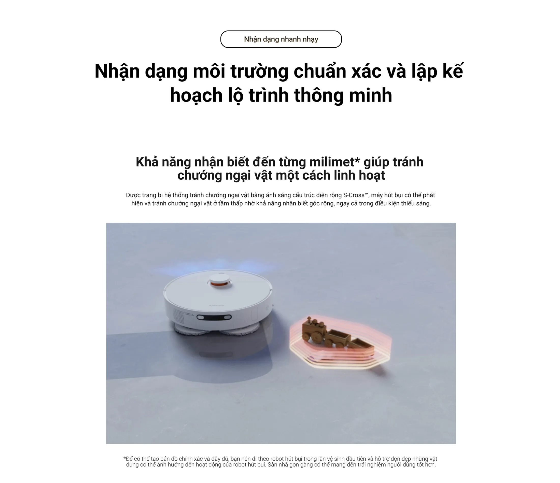 - Hệ thống tránh chướng ngại vật bằng ánh sáng cấu trúc rộng S‑Cross™: Nhận diện vật cản chính xác đến từng milimet, giúp robot di chuyển linh hoạt ngay cả trong điều kiện thiếu sáng.