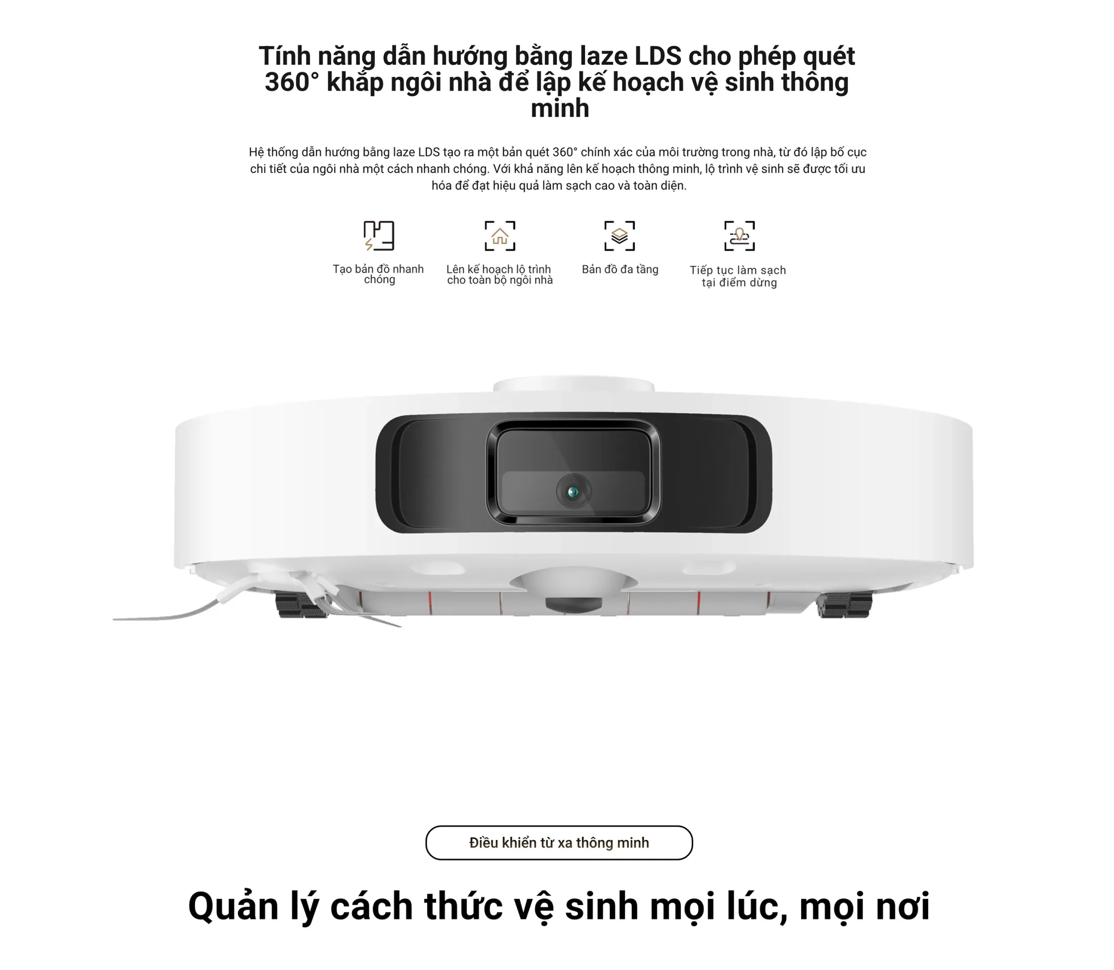 - Dẫn hướng bằng laze LDS: Quét 360° toàn bộ ngôi nhà để lập bản đồ và lên kế hoạch vệ sinh tối ưu.