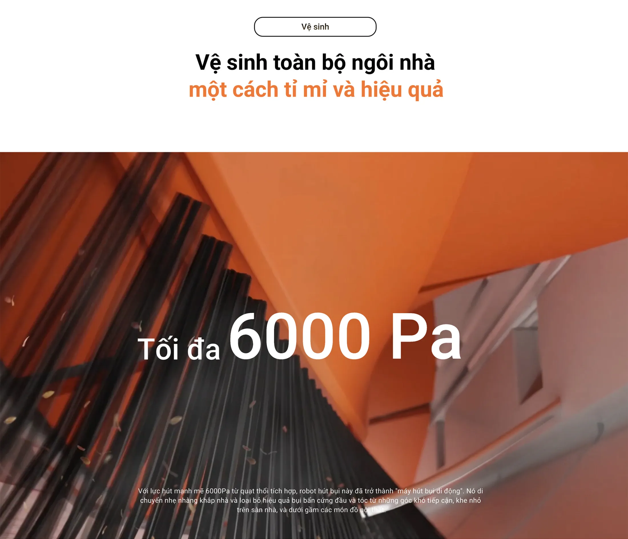 - Hiệu suất hút mạnh mẽ: Lực hút lên tới 6000 Pa, giúp loại bỏ bụi bẩn cứng đầu, tóc động vật và các mảnh vụn từ mọi góc của ngôi nhà.