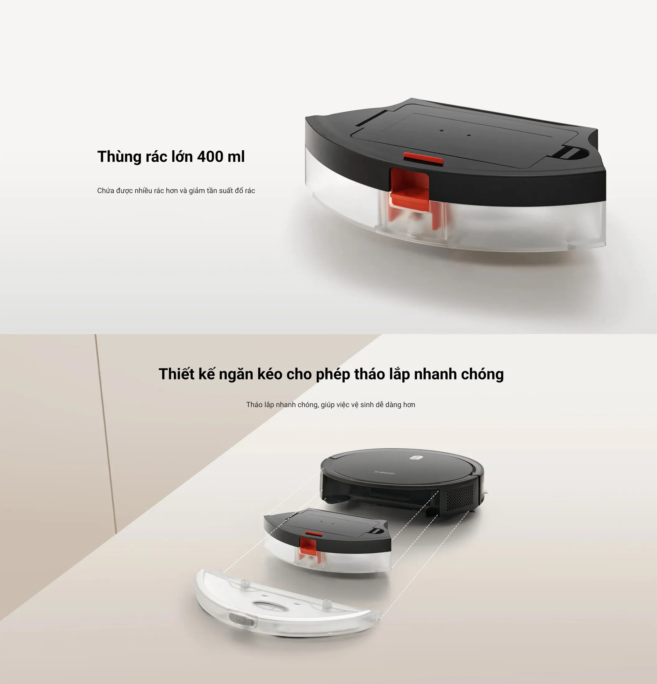 • Thùng rác lớn 400 ml: Giảm tần suất đổ rác, tiết kiệm thời gian bảo trì.
