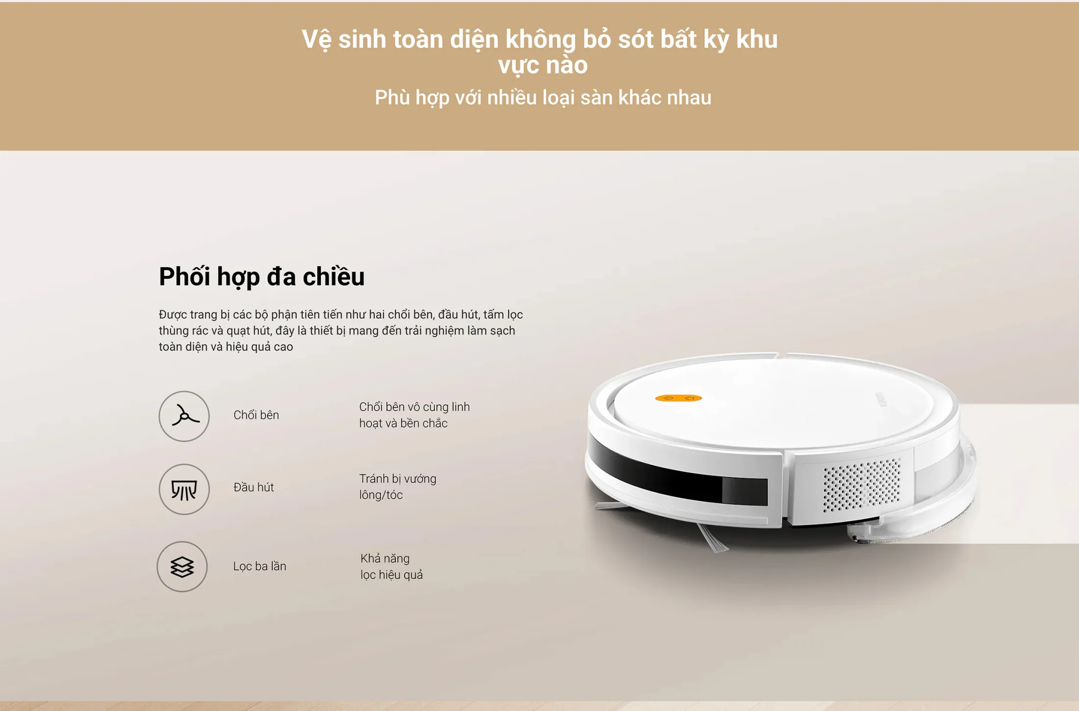 Đặc biệt, Xiaomi Robot Vacuum E5 còn là một thiết bị hoàn hảo cho những người nuôi thú cưng. Đầu hút thông minh và chổi bên giúp loại bỏ lông/tóc mà không cần phải dọn lại thủ công.