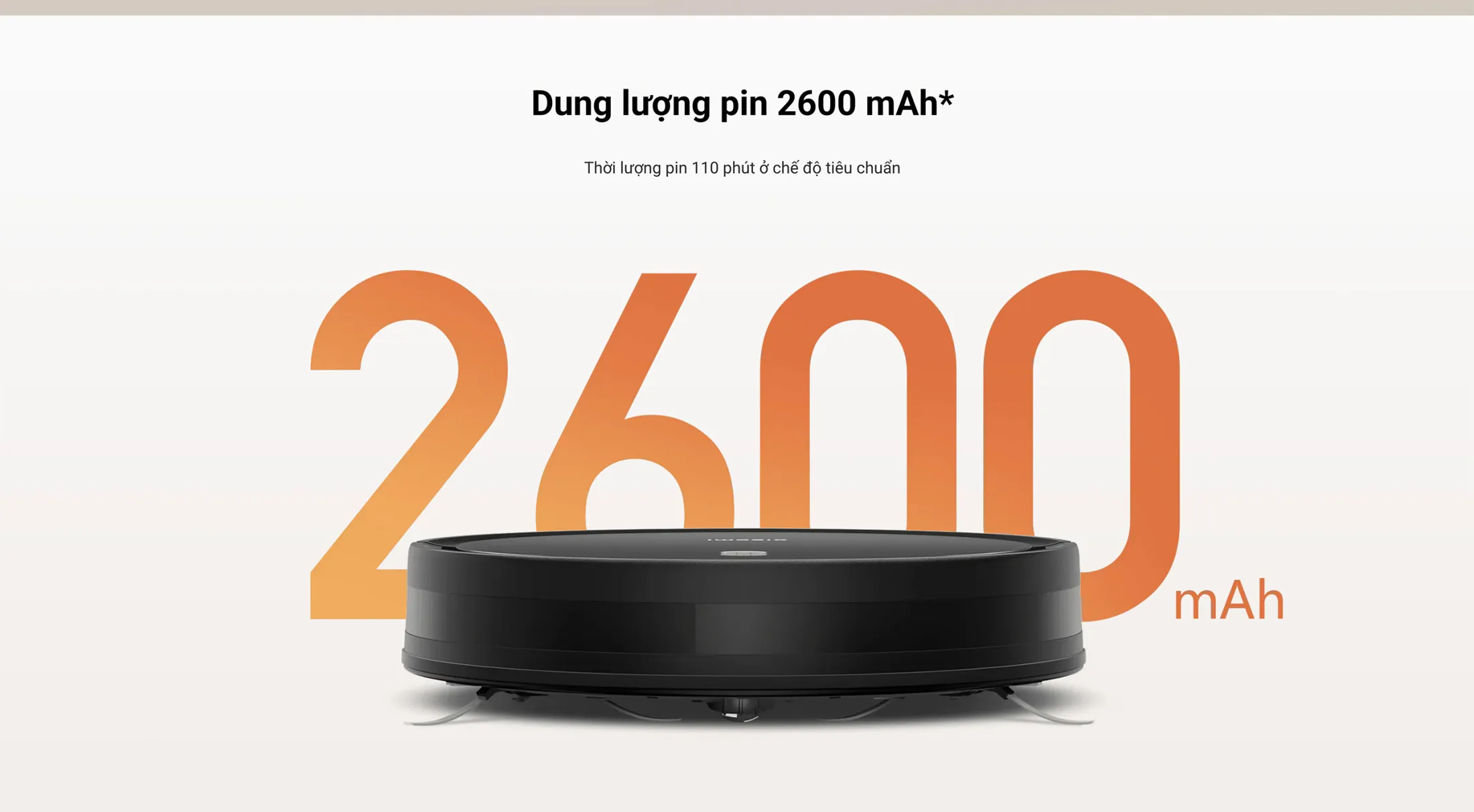 Robot Xiaomi E5 được trang bị pin 2600 mAh, cho phép hoạt động liên tục lên tới 110 phút ở chế độ tiêu chuẩn. Bạn không cần lo lắng về việc phải sạc thường xuyên khi đang thực hiện công việc trong ngày.
