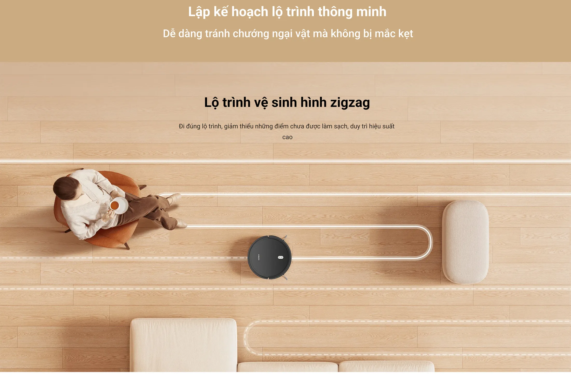 • Điều hướng zigzag: Đảm bảo mọi góc sàn được làm sạch một cách đầy đủ.