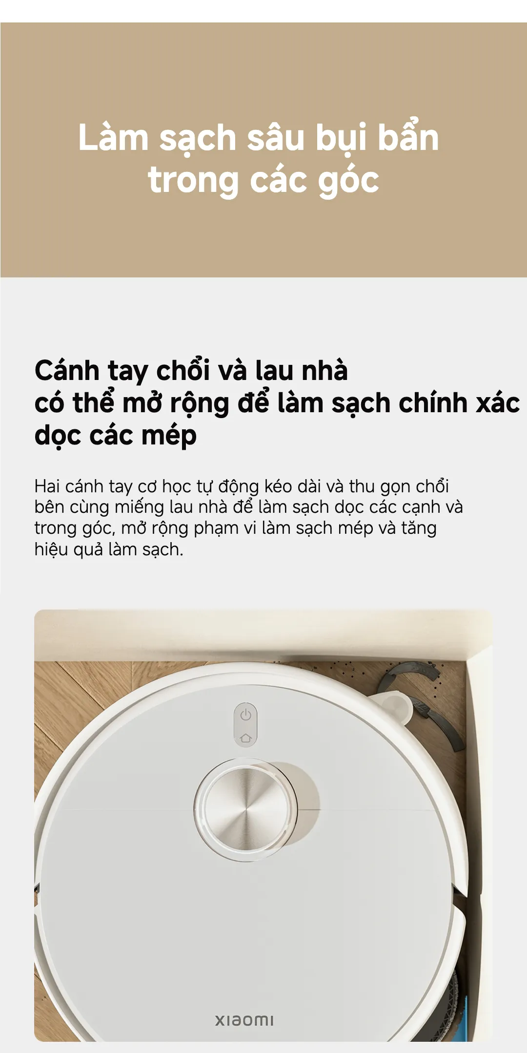 Cánh tay cơ học robot là một trong những điểm mạnh khiến Robot Xiaomi S40 Pro trở nên đặc biệt. Khi di chuyển, hai cánh tay này tự động kéo dài hoặc thu gọn để lau sạch mép tường và các góc nhỏ mà nhiều robot khác thường bỏ qua.