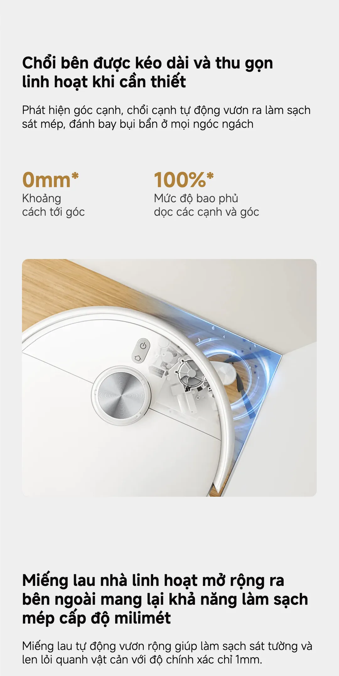 - Làm sạch mép sàn: Miếng lau nhà tự động vươn rộng và di chuyển sát tường với độ chính xác chỉ 1mm. Nhờ vậy, các vùng gần tường mà trước đây thường bị bỏ sót sẽ được làm sạch hoàn hảo.