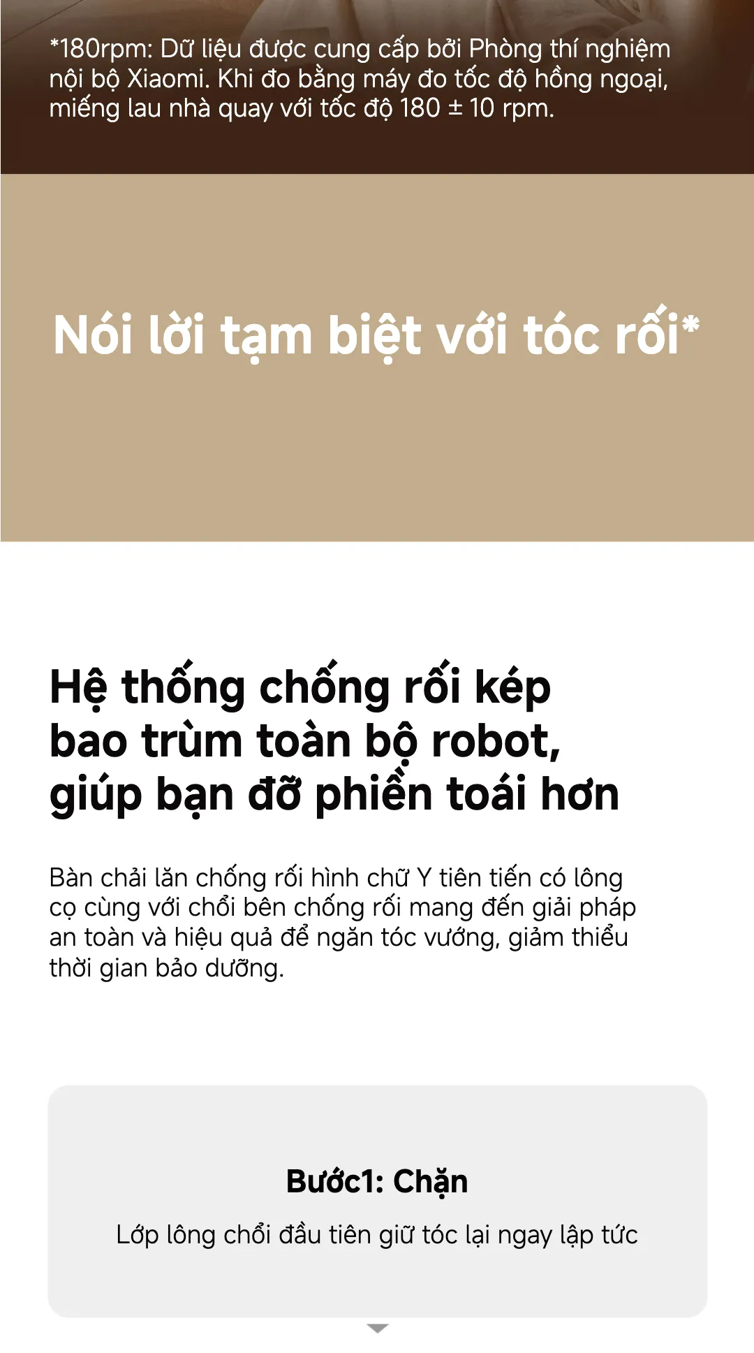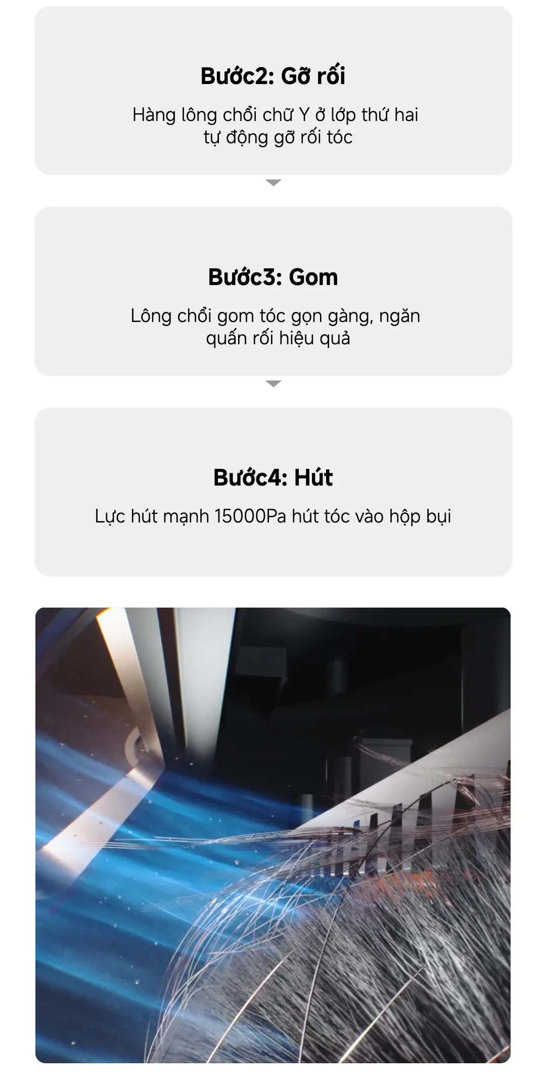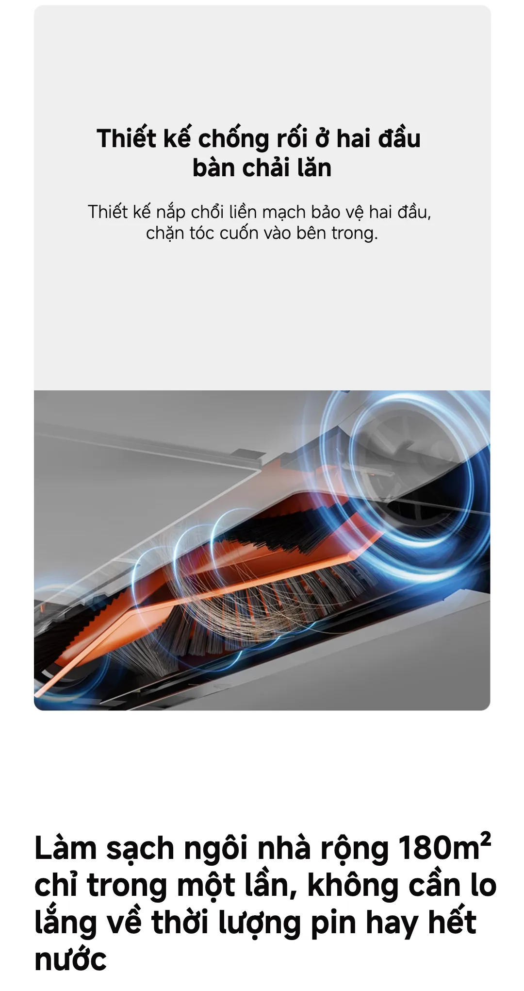 Với bàn chải lăn hình chữ Y cùng chổi bên chống rối, robot đã được thiết kế để giảm thiểu tình trạng tóc cuốn vào máy. Khi gặp lông: