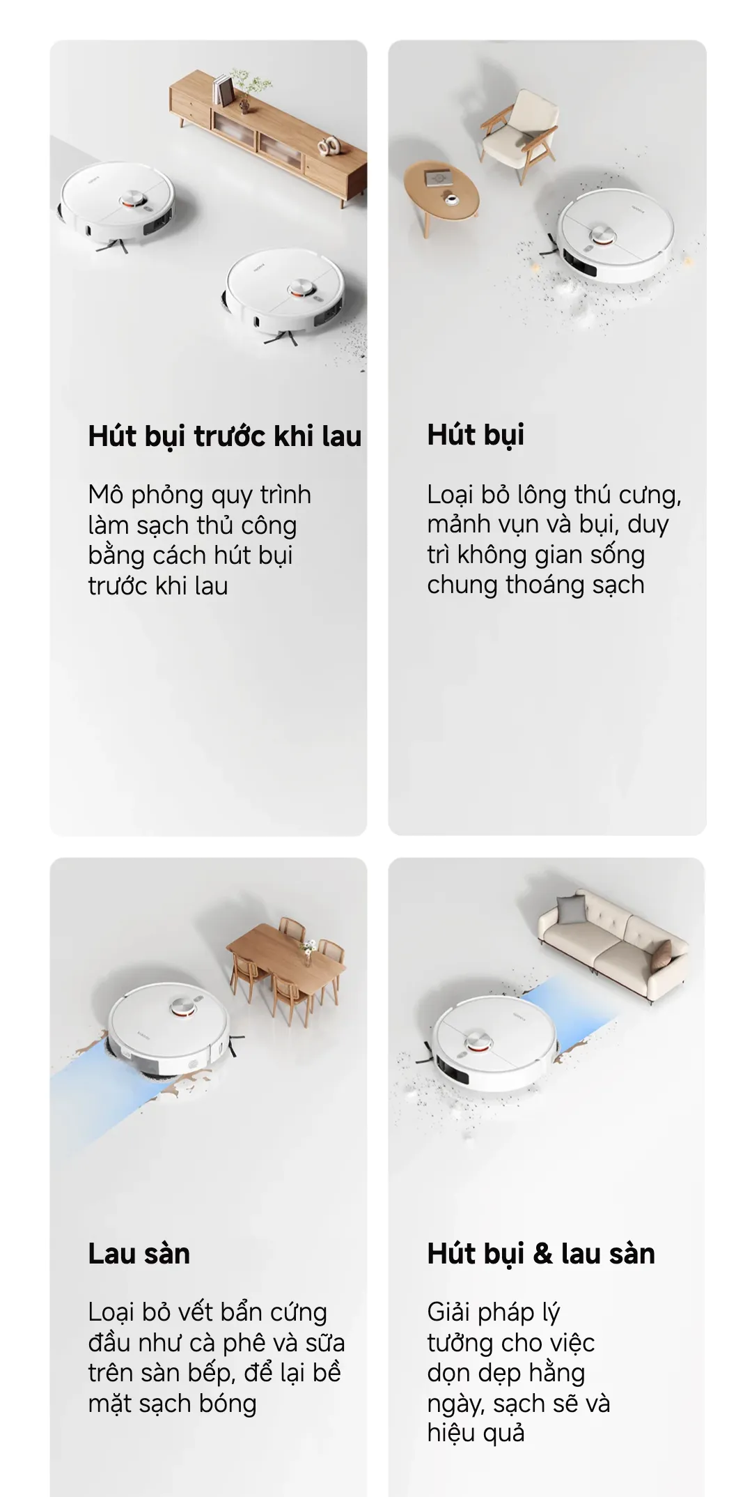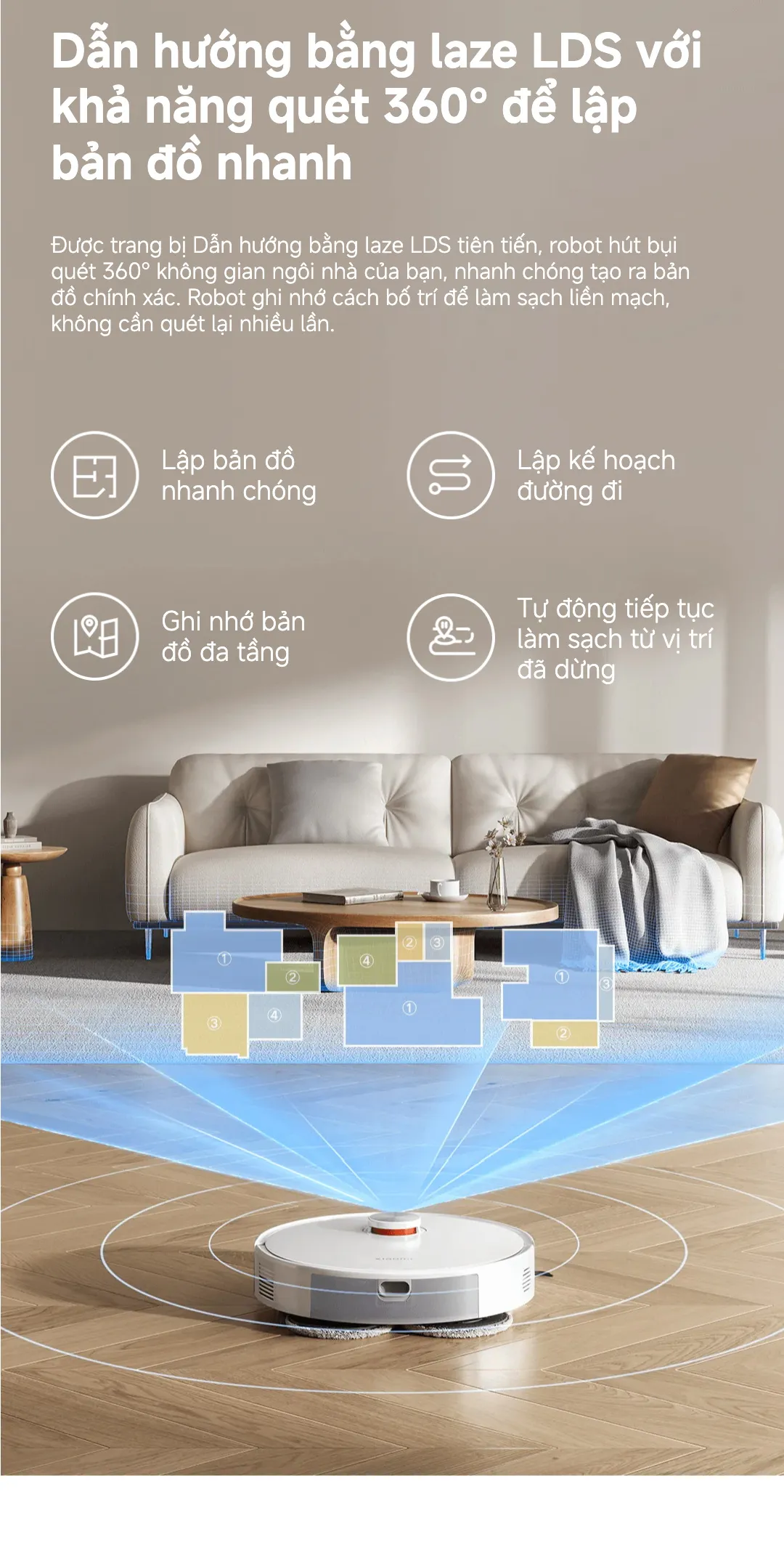 Sử dụng công nghệ LDS laser, robot quét không gian một lần để tạo ra bản đồ 3D chính xác. Nhờ đó, nó có thể: