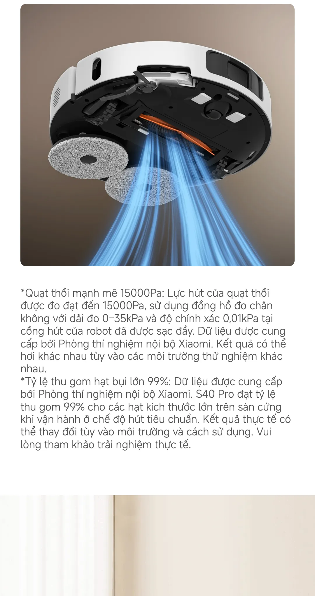 Được ra mắt với nhiều cải tiến vượt trội, Robot Xiaomi S40 Pro hướng tới mục tiêu “làm sạch sâu hơn, mang lại sự an tâm cho bạn”. Các tính năng chính của nó bao gồm: